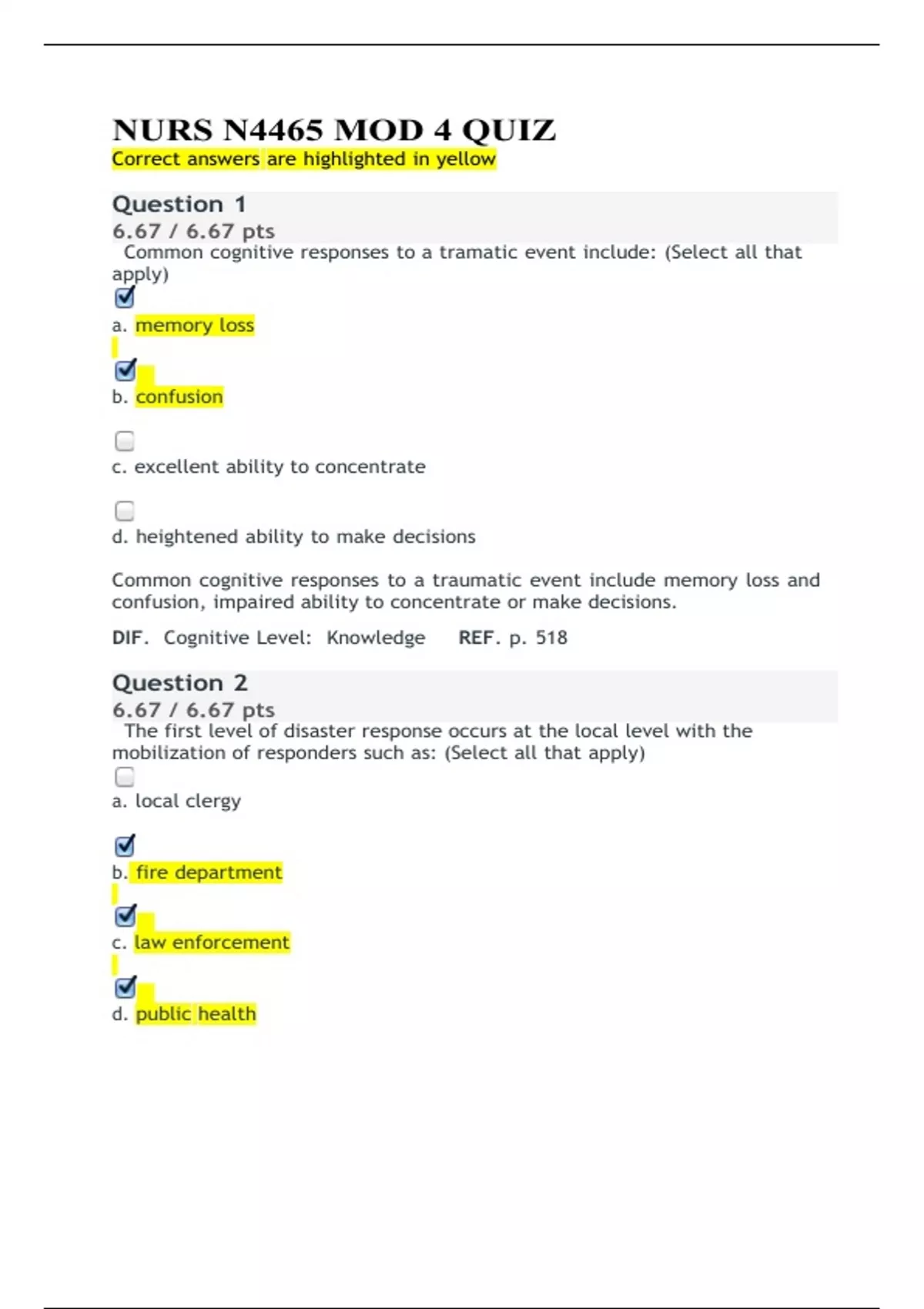 NURS N4465 MOD 4 QUIZ Correct answers are highlighted in yellow Common cognitive responses to a tramatic event include: (Select all that apply) a. memory loss b. confusion c. excellent ability to concentrate d. heightened ability to make decisions Common cognitive responses to a traumatic event include memory loss and confusion, impaired ability to concentrate or make decisions. DIF. Cognitive Level: Knowledge REF. p. 518 The first level of disaster response occurs at the local level with the mobilization of responders such as: (Select all that apply) a. local clergy b. fire department c. law enforcement d. public health The first level of disaster response occurs at the local level with the mobilization of responders such as fire department, law enforcement, and public health. DIF. Cognitive Level: Knowledge REF.p. 515 The transmission of communicable diseases depends on the successful interaction of the following: (Select all that apply) a. infectious agent b. pesticides c. the host d. the environment The transmission of communicable diseases depends on the successful interaction of the following: infectious agent, the host, and the environment. DIF. Cognitive Level: Knowledge REF. p. 290 Triage in a disaster setting centers on individuals only. True False Triage in a disaster setting involves both individual and population-based approaches. DIF. Cognitive Level: Knowledge REF. p. 526 Worldwide, infectious diseases are the leading killer of older adults. True False Worldwide, infectious diseases are the leading killer of children and young adults. DIF. Cognitive Level: Knowledge REF. p. 289 A method used by public health workers to track the source of an infection in the Watersedge case is known as the: a. multiple causation theory b. DNA mapping c. baseline screening d. mapping technique A method used by public health workers to track the source of an infection in the Watersedge case is known as mapping technique. DIF. Cognitive Level: Knowledge REF. Course Video Examples of infectious disease interventions based on primary prevention include: (Select all that apply) a. restaurant inspections b. rabies pre-exposure immunization c. irresponsible sexual behavior d. tetanus boosters and flu shots Examples of infectious disease interventions based on primary prevention include: restaurant inspections, rabies pre-exposure immunizations, tetanus boosters, and flu shots. DIF. Cognitive Level: Knowledge REF. p. 297 Following a disaster event, nurses can expect the victims to exhibit behavioral and emotional responses such as: (Select all that apply) a. irritability b. shock c. numbness d. being in control Following a disaster event, nurses can expect the victims to exhibit behaviors including irritability, shock, and numbness. DIF. Cognitive Level: Knowledge REF. p. 518 Human immunodeficiency virus (HIV) is transmitted through exposure to: (Select all that apply) a. contaminated air b. blood