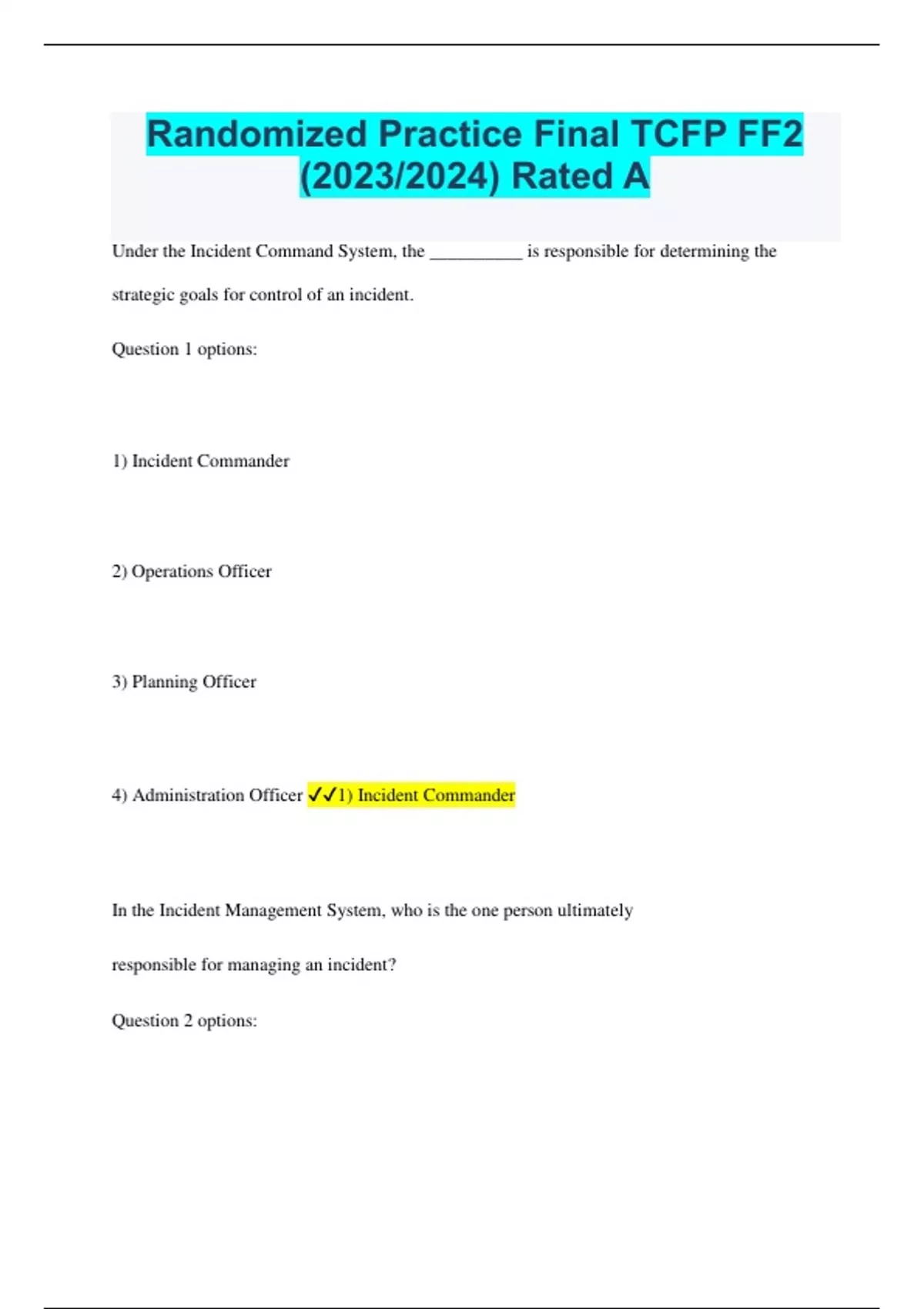 Randomized Practice Final TCFP FF2 (2023/2024) Rated A Under the Incident Command System, the __________ is responsible for determining the strategic goals for control of an incident. Question 1 options: 1) Incident Commander 2) Operations Officer 3) Planning Officer 4) Administration Officer 1) Incident Commander In the Incident Management System, who is the one person ultimately responsible for managing an incident? Question 2 options: 1) A Chief Officer 2) The Planning Chief 3) The Incident Commander 4) The Operations Chief 3) The Incident Commander 6.2.1 REPORTS 6 National Fire Incident Reporting System information is transmitted to the: Question 3 options: 1) U. S. Fire Administration. 2) Emergency Management. 3) Department of Homeland Security. 4) National Fire Protection Association. 1) U. S. Fire Administration. 6.2.2 COMMUNICATIONS 28 The tracking of personnel working at an incident requires a system that is standardized for every incident to establish: Question 4 options: 1) accountability. 2) chain of command. 3) unity of command. 4) span of control. 1) accountability. 6.2.2 COMMUNICATIONS 21 An employee becomes frustrated because they cannot comply with conflicting orders from different bosses. This situation was most likely caused by a violation of: Question 5 options: 1) chain of command. 2) division of labor. 3) span of control. 4) unity of command. 4) unity of command. 6.3.1 LIQUID