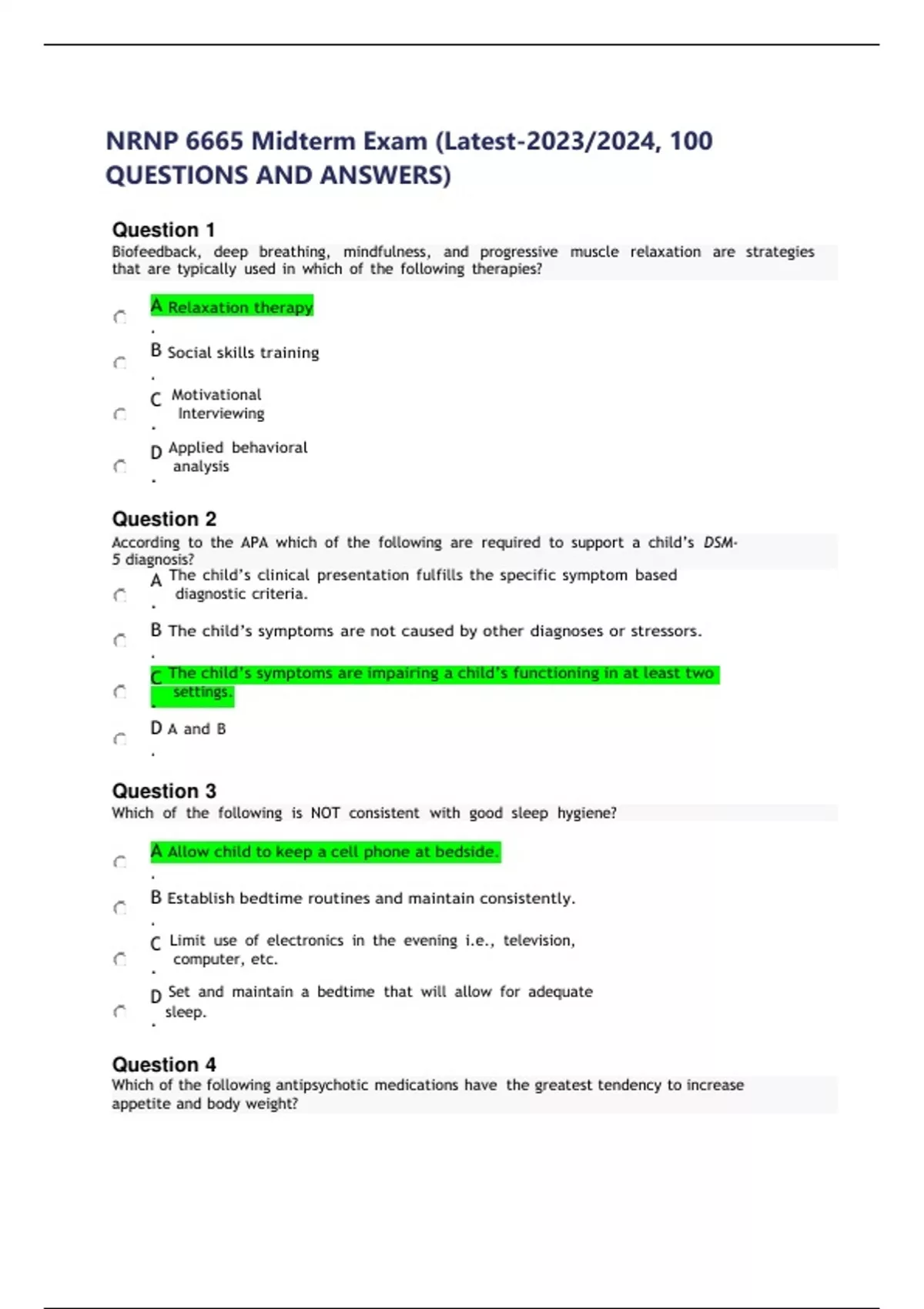 Question 1 A Relaxation therapy . B Social skills training . C Motivational . Interviewing D Applied behavioral . analysis Question 2 A The child’s clinical presentation fulfills the specific symptom based . diagnostic criteria. B The child’s symptoms are not caused by other diagnoses or stressors. . C The child’s symptoms are impairing a child’s functioning in at least two . settings. D A and B . Question 3 Which of the following is NOT consistent with good sleep hygiene?