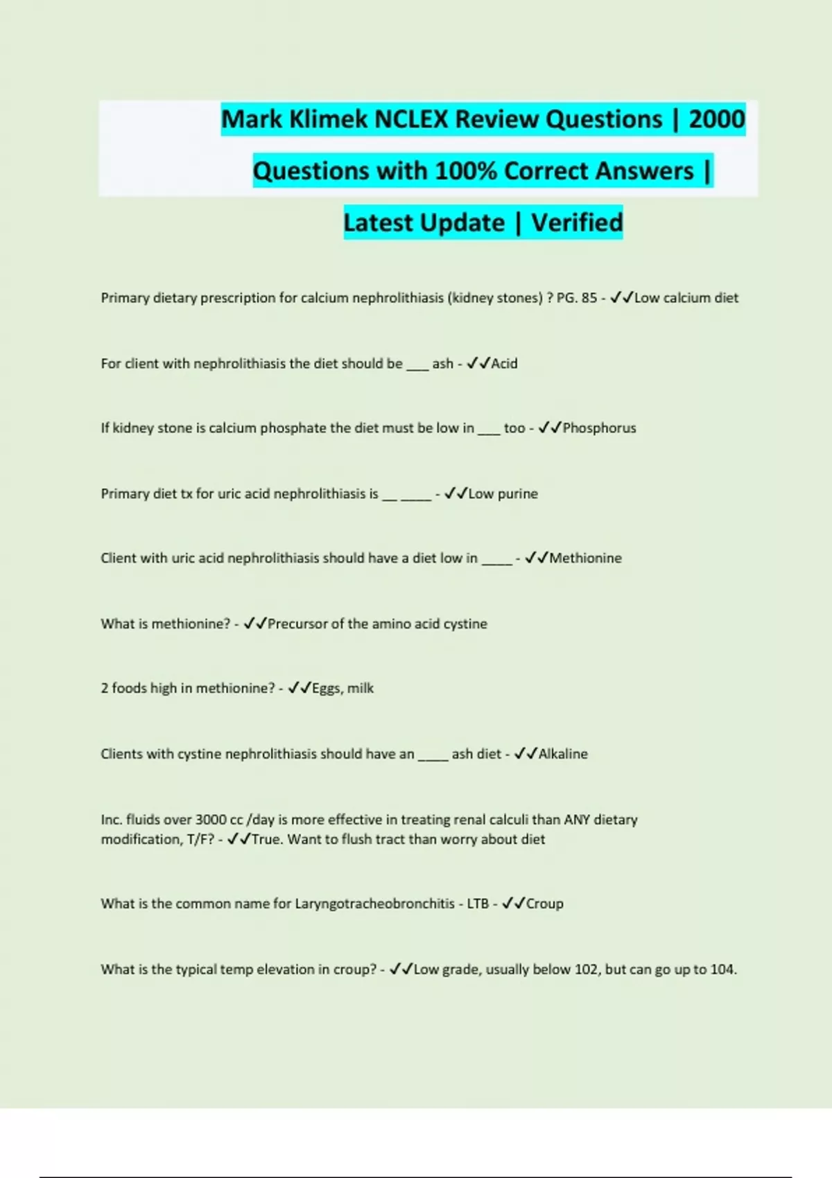 Mark Klimek NCLEX Review Questions | 2000 Questions with 100% Correct Answers | Latest Update | Verified Primary dietary prescription for calcium nephrolithiasis (kidney stones) ? PG. 85 - Low calcium diet For client with nephrolithiasis the diet should be ___ ash - Acid If kidney stone is calcium phosphate the diet must be low in ___ too - Phosphorus Primary diet tx for uric acid nephrolithiasis is __ ____ - Low purine Client with uric acid nephrolithiasis should have a diet low in ____ - Methionine What is methionine? - Precursor of the amino acid cystine 2 foods high in methionine? - Eggs, milk Clients with cystine nephrolithiasis should have an ____ ash diet - Alkaline Inc. fluids over 3000 cc /day is more effective in treating renal calculi than ANY dietary modification, T/F? - True. Want to flush tract than worry about diet What is the common name for Laryngotracheobronchitis - LTB - Croup What is the typical temp elevation in croup? - Low grade, usually below 102, but can go up to 104.