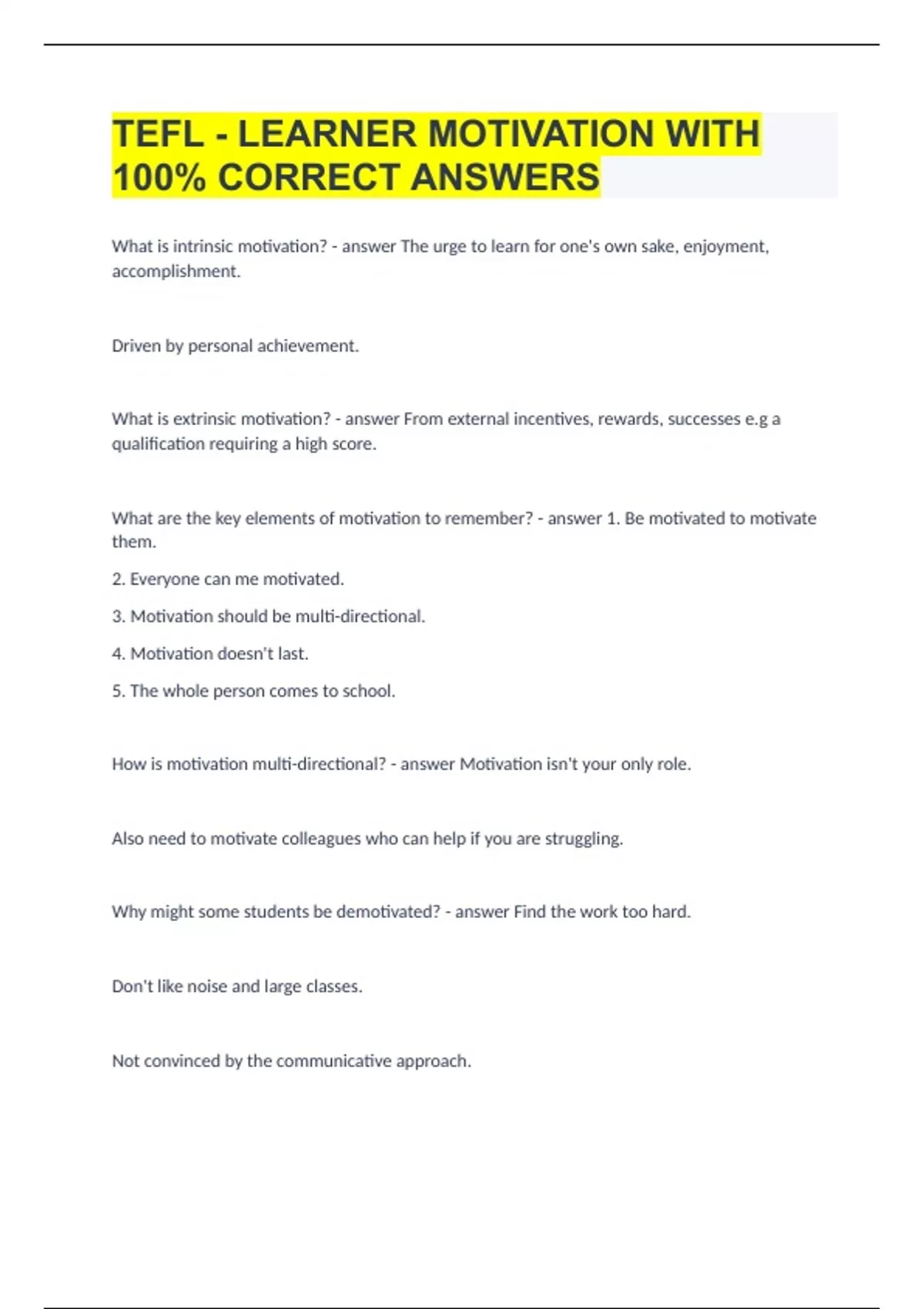 TEFL - LEARNER MOTIVATION WITH 100% CORRECT ANSWERS