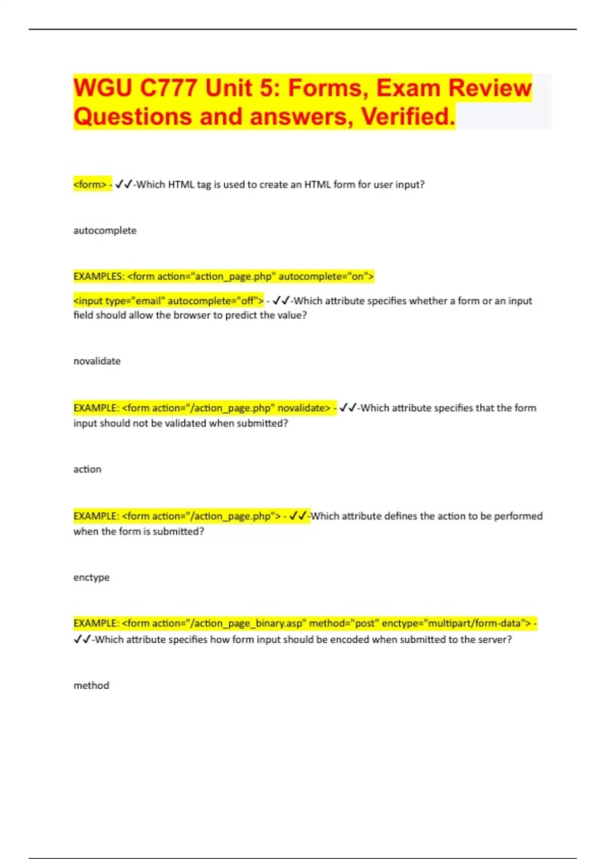 WGU C777 Unit 5: Forms, Exam Review Questions and answers, Verified. <form> - -Which HTML tag is used to create an HTML form for user input? autocomplete EXAMPLES: <form action="action_" autocomplete="on"> <input type="email" autocomplete="off"> - -Which attribute specifies whether a form or an input f ield should allow the browser to predict the value? novalidate EXAMPLE: <form action="/action_" novalidate> - -Which attribute specifies that the form input should not be validated when submitted? action EXAMPLE: <form action="/action_"> - -Which attribute defines the action to be performed when the form is submitted? enctype EXAMPLE: <form action="/action_page_" method="post" enctype="multipart/form-data"> - -Which attribute specifies how form input should be encoded when submitted to the server? method EXAMPLE: <form action="/action_" method="get" target="_blank"> - -Which attribute specifies the HTTP method to be used when submitting the form data? target EXAMPLE: <form action="/action_" method="get" target="_blank"> - -Which attribute specifies where to display the response that is received after submitting the form? list EXAMPLE:<input list="browsers"> <datalist id="browsers"> </datalist> - -Which attribute refers to pre-defined options contained in a datalist?