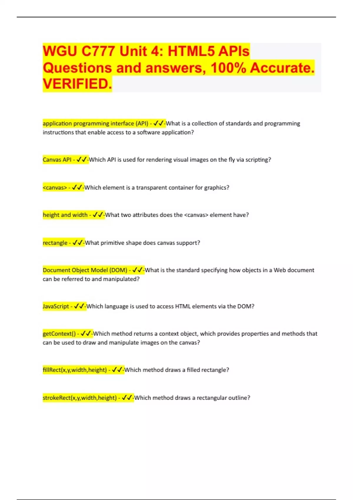WGU C777 Unit 4: HTML5 APIs Questions and answers, 100% Accurate. VERIFIED. application programming interface (API) - -What is a collection of standards and programming instructions that enable access to a software application? Canvas API - -Which API is used for rendering visual images on the fly via scripting? <canvas> - -Which element is a transparent container for graphics? height and width - -What two attributes does the <canvas> element have? rectangle - -What primitive shape does canvas support? Document Object Model (DOM) - -What is the standard specifying how objects in a Web document can be referred to and manipulated? JavaScript - -Which language is used to access HTML elements via the DOM? getContext() - -Which method returns a context object, which provides properties and methods that can be used to draw and manipulate images on the canvas? f illRect(x,y,width,height) - -Which method draws a filled rectangle? strokeRect(x,y,width,height) - -Which method draws a rectangular outline? clearRect(x,y,width,height) - -Which method clears the specified area and makes it fully transparent? beginPath() - -Which method begins a drawing path or resets the current path? closePath() - -Which method ends the current drawing path?