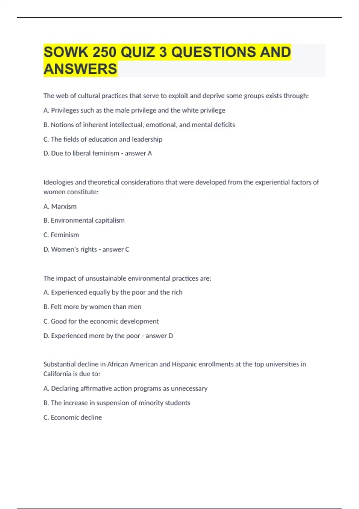 The web of cultural practices that serve to exploit and deprive some groups exists through: A. Privileges such as the male privilege and the white privilege B. Notions of inherent intellectual, emotional, and mental deficits C. The fields of education and leadership D. Due to liberal feminism A Ideologies and theoretical considerations that were developed from the experiential factors of women constitute: A. Marxism B. Environmental capitalism C. Feminism D. Women's rights C The impact of unsustainable environmental practices are: A. Experienced equally by the poor and the rich B. Felt more by women than men C. Good for the economic development D. Experienced more by the poor D Substantial decline in African American and Hispanic enrollments at the top universities in California is due to: A. Declaring affirmative action programs as unnecessary B. The increase in suspension of minority students C. Economic decline D. Stereotype vulnerability A The growing prison population is due to: A. Economic crisis B. Social crisis C. Mandatory minimum drug sentencing D. The increasing poverty among children C African American males are disproportionately impacted by Anti-Drug Abuse Acts. A. True B. False A Devaluation, exploitation, and deprivation are experienced by the oppressed individual or group. A. True B. False A Privilege is an individual trait. A. True B. False B Being categorized as a member of upper class through inheritance is a privilege. A. True B. False A Affirmative action programs are designed for the purpose of creating preferences for minority group members in education and employment A. True B. False B Affirmative action is based on the notion that members of groups with unequal status need special privileges A. True B. False B The Failure of gun control policies are an indication of: A. The power of special interest groups B. The power of the constitutional rights C. The power of institutional arrangements based on ideologies D. The power of violence as an emotive mechanism for humans A The increased fear based policing of the states of the federal union can be seen in the fact that: A. The law enforcement and the public have increasing levels of violent confrontations B. Public's distrust of the police C. There are 20 states in 2011 with Stand Your Ground laws D. There are many youth who are convicted of crimes C Justice Sonia Sotomayor, the Supreme Court judge supports A. NRA's advocacy of gun ownership B. The American government in supporting the right of gun ownership C. Balanced gun control laws that protects the public without violating the constitutional rights D. The ban of guns C The Convention on the rights of Children supports: A. Universal rights of the children not to participate in violent crime B. Universal rights of the children to nutrition and leisure C. Universal rights of the children to choose their adult caregivers D. Universal rights of the children to individuality B Corporal punishment of children by parents is prohibited in European society on the premise that: A. children are human beings B. parents are custodians expected to provide care without beating their children C. children know how to behave through intrinsic motivation D. children are the parents' teachers A First cluster of articles of the CRC ensures the rights of children to: A. Have their own way in decision making about self-care B. Know about their birth family and cultural identity C. To quality health care D. To healthy work environment B It is illegal to strike a child in Sweden. A. True B. False A The seventh cluster of articles of the CRC offer the rights of Education, Leisure, Play, and Culture to children. A. True B. False B The right not to be exploited is given under the third luster of articles of the CRC A. True B. False A Access to immunizations is granted under the first luster of articles of the CRC A. True B. False B Health care policy in the United States until the passage of the recent affordable Care Act is: A. Residual B. Institutional C. Socialist D. National A The Affordable Care Act: A. Provides health care coverage selectively to those who qualify B. Follows the single-payer health care model C. Ensures the universal application of health care benefits on a system of subsidies, premiums and reimbursements D. Does not provide care for preexisting conditions C