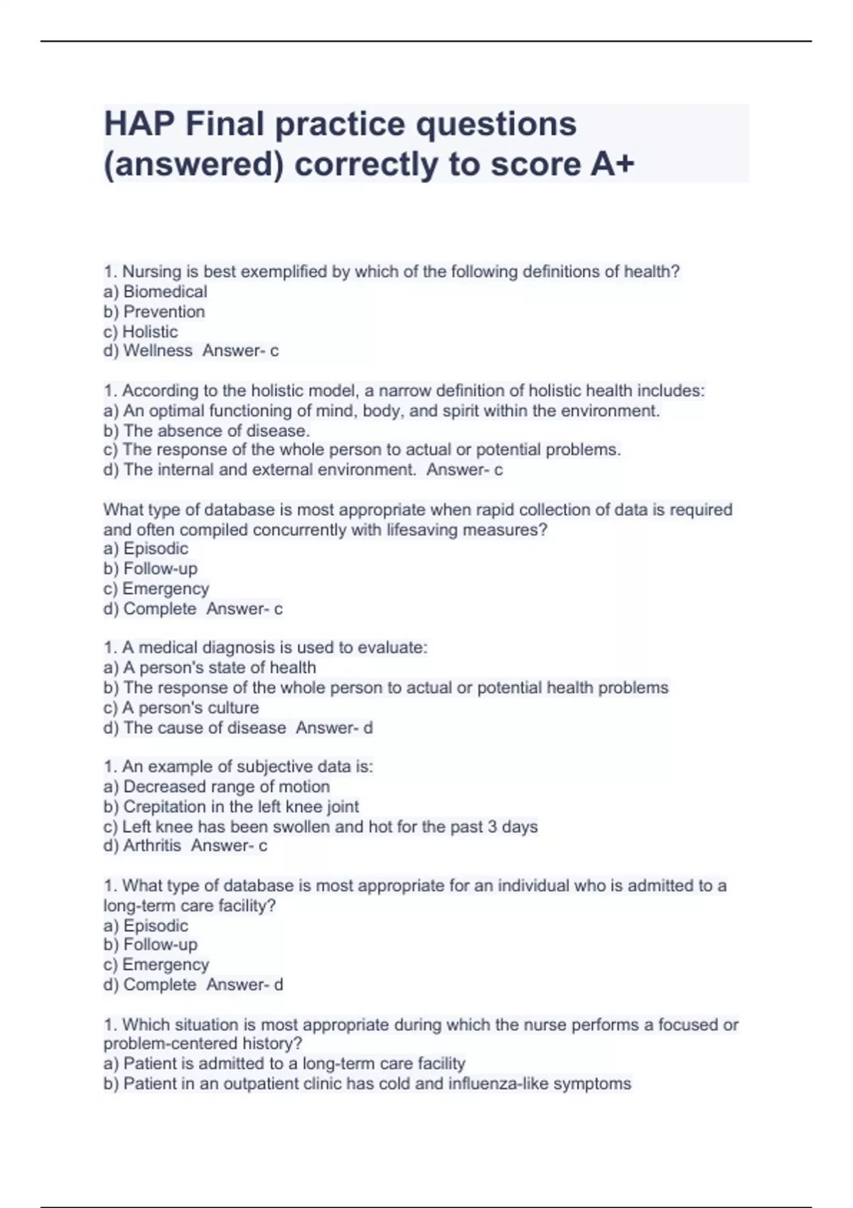 hap final practice questions answered correctly