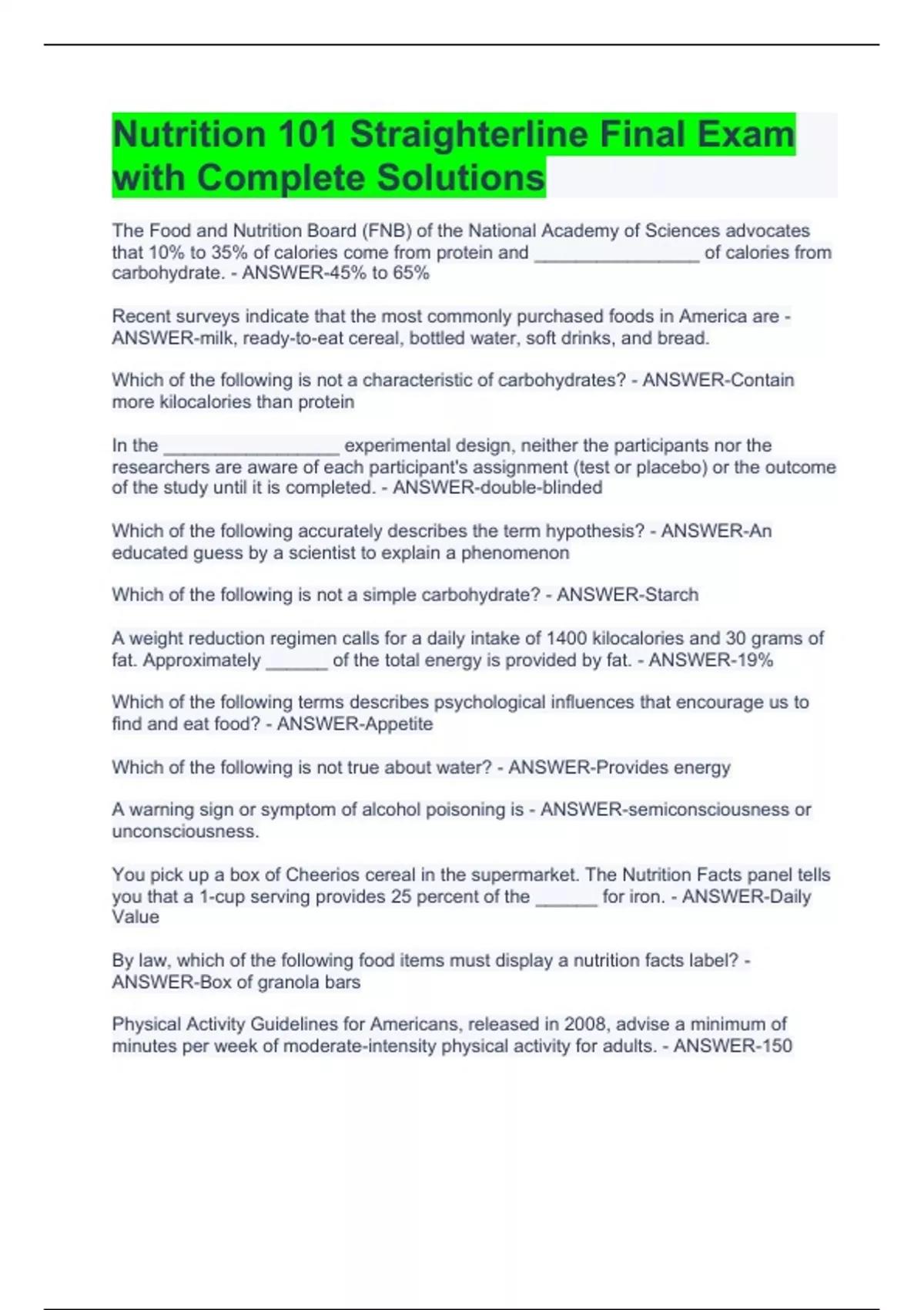 The Food and Nutrition Board (FNB) of the National Academy of Sciences advocates that 10% to 35% of calories come from protein and ________________ of calories from carbohydrate. - ANSWER-45% to 65% Recent surveys indicate that the most commonly purchased foods in America are - ANSWER-milk, ready-to-eat cereal, bottled water, soft drinks, and bread. Which of the following is not a characteristic of carbohydrates? - ANSWER-Contain more kilocalories than protein In the _________________ experimental design, neither the participants nor the researchers are aware of each participant's assignment (test or placebo) or the outcome of the study until it is completed. - ANSWER-double-blinded Which of the following accurately describes the term hypothesis? - ANSWER-An educated guess by a scientist to explain a phenomenon Which of the following is not a simple carbohydrate? - ANSWER-Starch A weight reduction regimen calls for a daily intake of 1400 kilocalories and 30 grams of fat. Approximately ______ of the total energy is provided by fat. - ANSWER-19% Which of the following terms describes psychological influences that encourage us to find and eat food? - ANSWER-Appetite Which of the following is not true about water? - ANSWER-Provides energy A warning sign or symptom of alcohol poisoning is - ANSWER-semiconsciousness or unconsciousness. You pick up a box of Cheerios cereal in the supermarket. The Nutrition Facts panel tells you that a 1-cup serving provides 25 percent of the ______ for iron. - ANSWER-Daily Value By law, which of the following food items must display a nutrition facts label? - ANSWER-Box of granola bars Physical Activity Guidelines for Americans, released in 2008, advise a minimum of minutes per week of moderate-intensity physical activity for adults. - ANSWER-150
