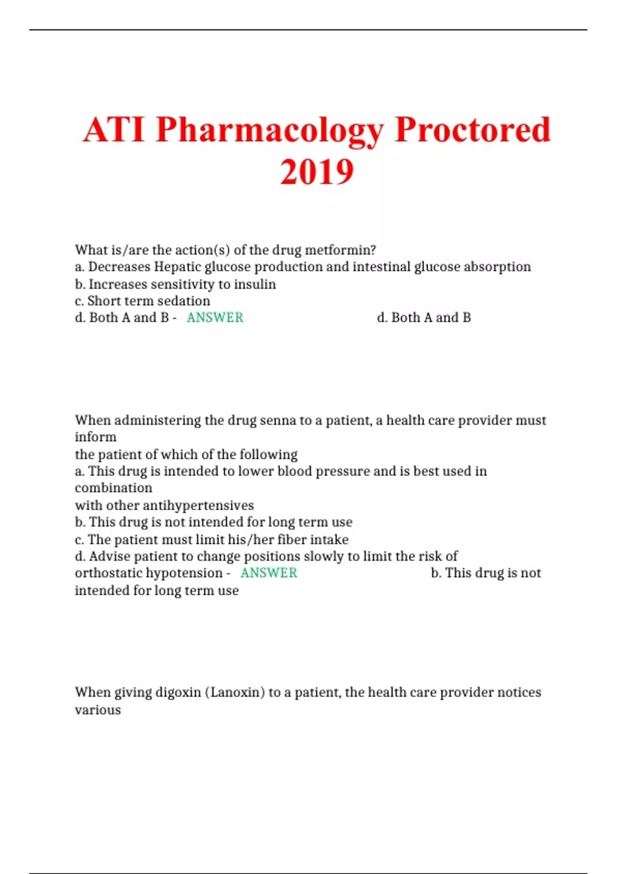 ATI Pharmacology proctored exam study guide a nurse is preparing to administer a drug to a client. In which of the following sections of a drug handbook should the nurse look to determine if the drug has more than one use? -adverse effects -indications -pharmacokinetics -nursing implications - ANSWER indications a nurse is reviewing a drug handbook prior to administering a drug to a client who has kidney disease. The handbook states that the drug can be administered but identifies certain risks. Which of the following terms describes these risks? contraindications precautions paradoxical effects adverse effects - ANSWER precautions a nurse is caring for a client who is taking diphenhydramine for insomnia and reports drowsiness. The nurse should identify that drowsiness indicates which of the following? therapeutic effect adverse reaction contraindication precaution - ANSWER therapeutic effect