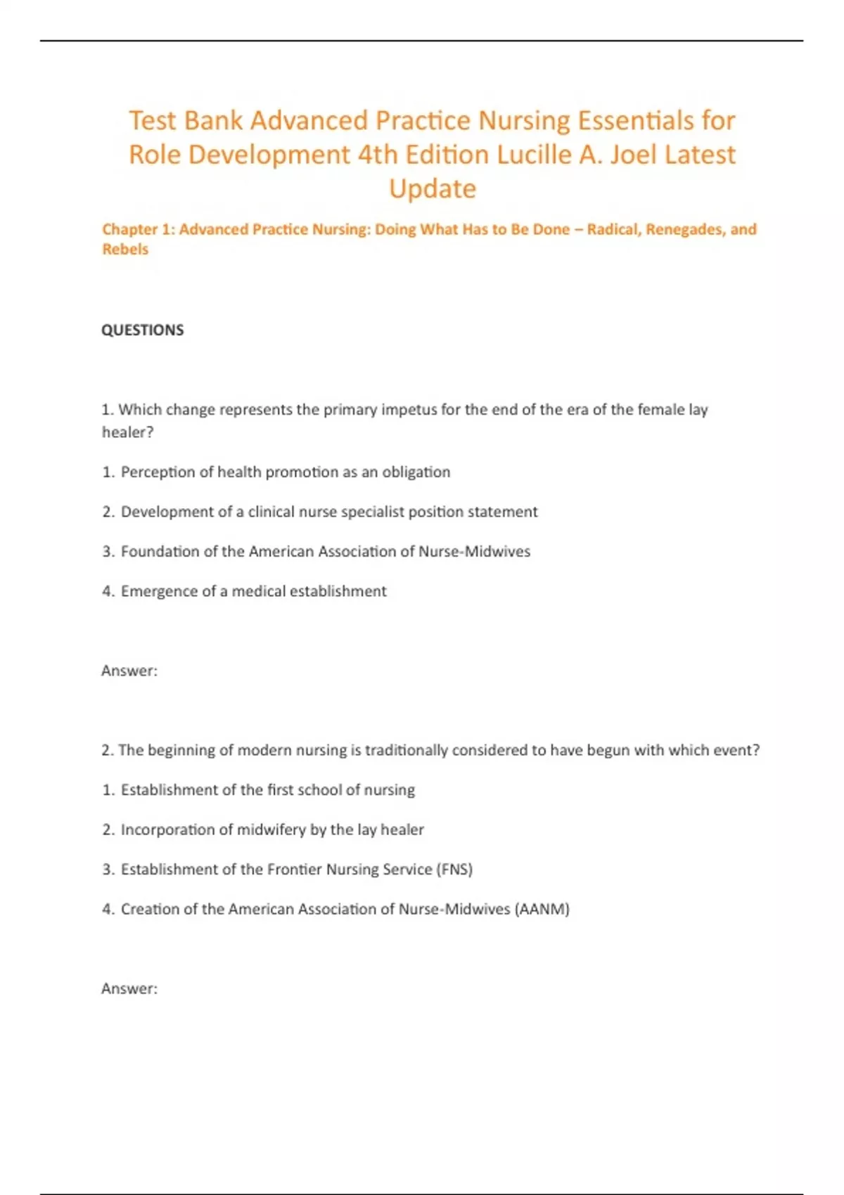 Test Bank Advanced Practice Nursing Essentials for Role Development 4th Edition Lucille A. Joel Latest Update