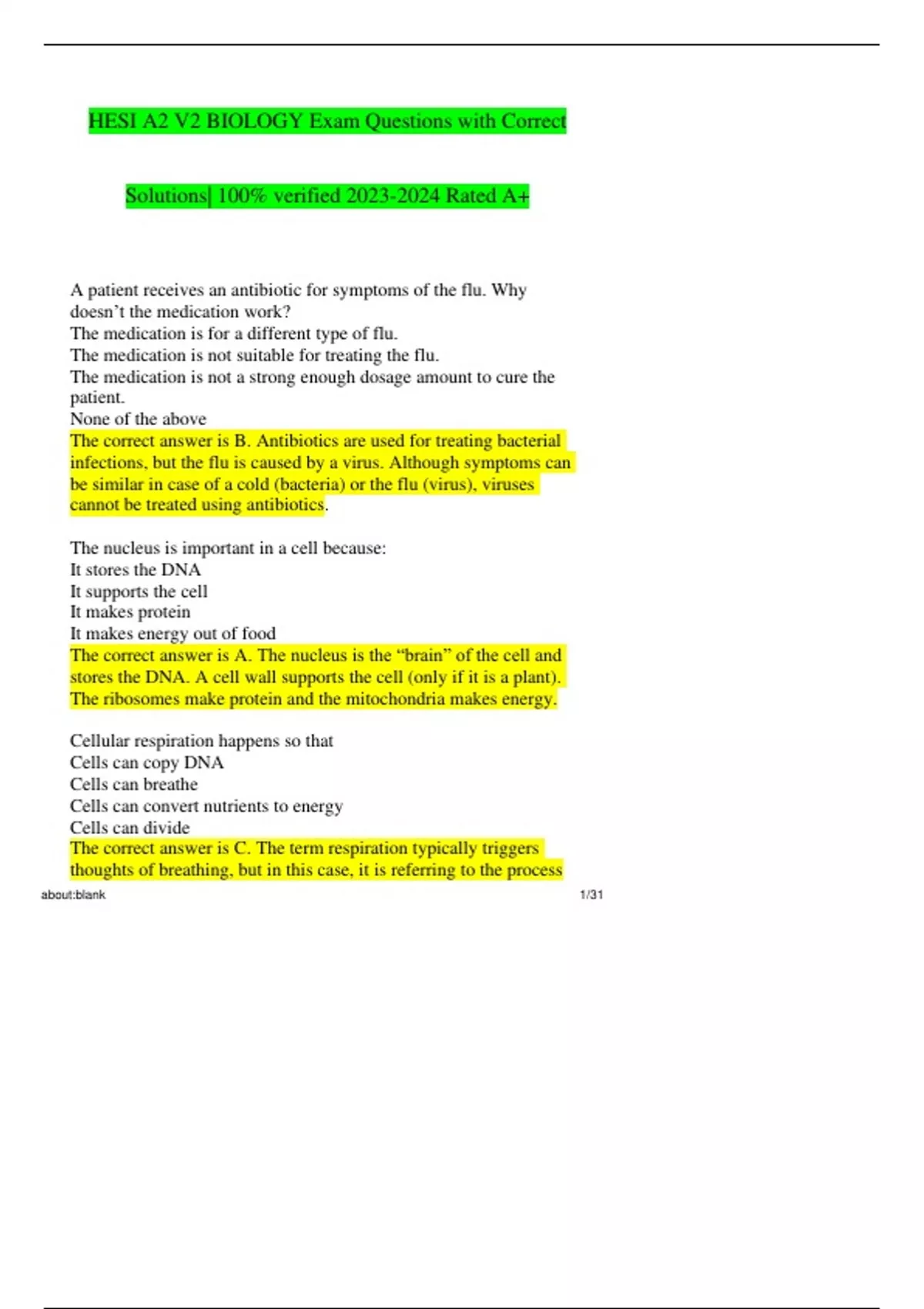 A patient receives an antibiotic for symptoms of the flu. Why doesn’t the medication work? The medication is for a different type of flu. The medication is not suitable for treating the flu. The medication is not a strong enough dosage amount to cure the patient. None of the above The correct answer is B. Antibiotics are used for treating bacterial infections, but the flu is caused by a virus. Although symptoms can be similar in case of a cold (bacteria) or the flu (virus), viruses cannot be treated using antibiotics. The nucleus is important in a cell because: It stores the DNA It supports the cell It makes protein It makes energy out of food The correct answer is A. The nucleus is the “brain” of the cell and stores the DNA. A cell wall supports the cell (only if it is a plant). The ribosomes make protein and the mitochondria makes energy. Cellular respiration happens so that Cells can copy DNA Cells can breathe Cells can convert nutrients to energy Cells can divide The correct answer is C. The term respiration typically triggers thoughts of breathing, but in this case, it is referring to the process