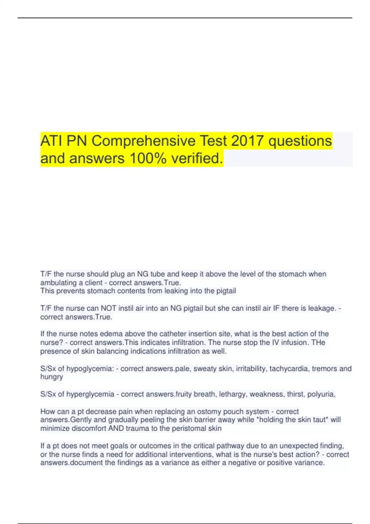 ATI PN Comprehensive Test 2017 questions and answers 100% verified. T/F the nurse should plug an NG tube and keep it above the level of the stomach when ambulating a client - correct answers.True. This prevents stomach contents from leaking into the pigtail T/F the nurse can NOT instil air into an NG pigtail but she can instil air IF there is leakage. - correct answers.True. If the nurse notes edema above the catheter insertion site, what is the best action of the nurse? - correct answers.This indicates infiltration. The nurse stop the IV infusion. THe presence of skin balancing indications infiltration as well. S/Sx of hypoglycemia: - correct , sweaty skin, irritability, tachycardia, tremors and hungry S/Sx of hyperglycemia - correct y breath, lethargy, weakness, thirst, polyuria, How can a pt decrease pain when replacing an ostomy pouch system - correct answers.Gently and gradually peeling the skin barrier away while *holding the skin taut* will minimize discomfort AND trauma to the peristomal skin If a pt does not meet goals or outcomes in the critical pathway due to an unexpected finding, or the nurse finds a need for additional interventions, what is the nurse's best action? - correct ent the findings as a variance as either a negative or positive variance. T/F Rifampin, for the tx of TB, can interact w/ and reduce the effectiveness of oral contraceptives, therefore the nurse should instruct the pt to use a secondary method to prevent pregnancy. - correct answers.True If a client taking Rifampin for the tx of TB complains of HA, fever, or muscle aches, what should the nurse's response be? - correct answers.Report the symptoms to HCP immediately as these indicate flu like symptoms and infection, which can lead to meningococcal meningitis A nurse in a providers office is reviewing pediculosis capitis management and prevention strategies w/ the parent of a school age child. What education should the nurse provide the parents with? - correct answers.Transmission of lice occurs via contact w/ personal items so store the childs clothing in a separate cubicle when at school. Do NOT use insecticides because they are a danger to young children and pets Boil brushes and combs in water for 10 minutes to kill lice and nits Dry bed linens and clothing in a HOT dryer for at least 20 minutes Contaminated non washable items should be sealed in a plastic bag for 14 days to kill the lice. Enoxaparin for the prevention of thrombosis should be administered how? - correct answers.SubQ Rotating injection sites A pt taking atorvastatin for hypercholesterolemia, experiences muscle pain, what does this indicate? - correct answers.This could be a manifestation of myopathy or muscle injury which is a potential serious adverse effect of statin drugs. Montelukast is a leukotriene modifier taken for asthma. Describe how it is appropriately used: - correct answers.Taken once daily for *maintenance* - it is NOT a rescue medication. How does the nurse appropriately obtain a blood draw? - correct the tourniquet to find a vein *in the antecubital fossa*, then release the tourniquet cleanse the insertion site allow the site to dry reapply the tourniquet obtain blood draw Describe the first stool passed by a newborn: - correct answers.Meconium that develops in utero dark green to black and viscous contains components of amniotic fluid, cells, intestinal secretions and occult blood A nurse in contributing to a teaching plan for a group of male adolescents about the adverse effects of anabolic steroid use. What are the manifestations that the nurse should include: - correct answers.Reduced ht potential d/t premature epiphyseal closure reducing the full ht potential Liver disorders Hyperlipidemia Breast enlargement Acne Edema When a pt uses rationalization it is used as a means to what: - correct fy unreasonable feelings, thoughts, or actions. ex. "I did not get a good grade because my teacher does not like me" When a pt uses denial, it is a means to what? - correct answers.Avoid unpleasant feelings, thoughts or needs by pretending they do not exist. ex. "I do not believe you because my mother cannot be gone" When a pt is compensating, the nurse would recognize this as what? - correct answers.The client is making up excuses for their negative behaviors. Ex. "When i've had a few drinks I feel much better about myself" What is suppression? - correct answers.The purposeful denial of an uncomfortable situation by putting it off until it is convenient for the client to address. ex. "I will call the doctor for my test results after I return from this vacation". A pt w/ a NG tube has continuous enteral feedings, what interventions should the nurse include: - correct answers.Aspirate gastric residual q 4 hrs Change enteral feeding bag and tubing q 24 hrs *W/hold feeding if more than 100ml to 250ml gastric residual volume is obtained* Measure the pH of gastric tube aspirate prior to administering nutrition, anything less than 5 indicates the tube resides in the stomach T/F sharing client information w/ the clients employer is a vilant of client confidentiality. The nurse should inform the employer he will need to speak directly with the client. - correct answers.True. A nurse is assisting w/ the care of a school age child immediately following surgery. The child weighs 21.8kg (48lbs) and has a chest tube applied to suction. What findings should the nurse report to the provider? - correct answers.Subcutaneous emphysema: this is an indication of an air leak under the clients skin. If there is more than 3mL/kg/hr of sanguineous drainage occurring for more than 2 to 3 consecutive hours following surgery this can indicate hemorrhaging and should be reported immediately. What are expected findings when a pt has a chest tube applied to suction: - correct nuous bubbling in the suction control chamber - this is because it contains water and when suction is applied to the unit, continuous bubbling occurs. Fluctuation in the water seal chamb