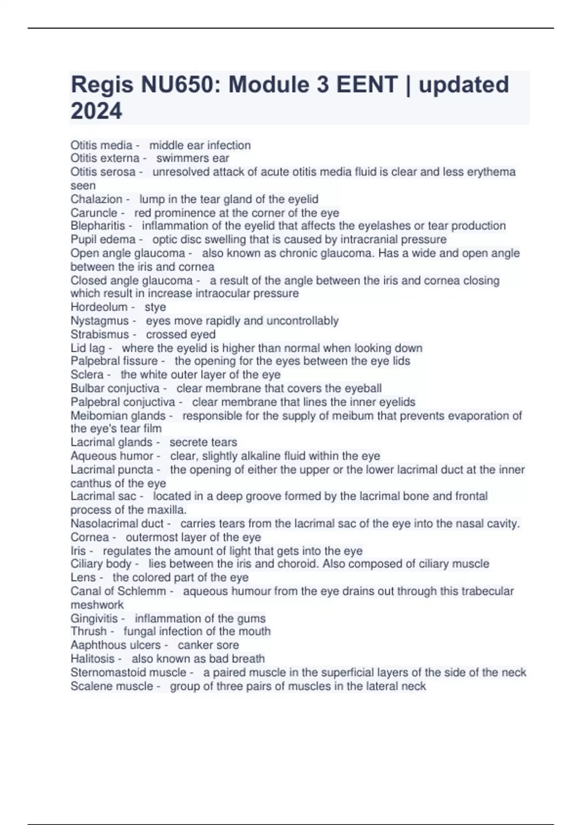 Regis NU650: Module 3 EENT | updated 2024 Otitis media - middle ear infection Otitis externa - swimmers ear Otitis serosa - unresolved attack of acute otitis media fluid is clear and less erythema seen Chalazion - lump in the tear gland of the eyelid Caruncle - red prominence at the corner of the eye Blepharitis - inflammation of the eyelid that affects the eyelashes or tear production Pupil edema - optic disc swelling that is caused by intracranial pressure Open angle glaucoma - also known as chronic glaucoma. Has a wide and open angle between the iris and cornea Closed angle glaucoma - a result of the angle between the iris and cornea closing which result in increase intraocular pressure Hordeolum - stye Nystagmus - eyes move rapidly and uncontrollably Strabismus - crossed eyed Lid lag - where the eyelid is higher than normal when looking down Palpebral fissure - the opening for the eyes between the eye lids Sclera - the white outer layer of the eye Bulbar conjuctiva - clear membrane that covers the eyeball Palpebral conjuctiva - clear membrane that lines the inner eyelids Meibomian glands - responsible for the supply of meibum that prevents evaporation of the eye's tear film