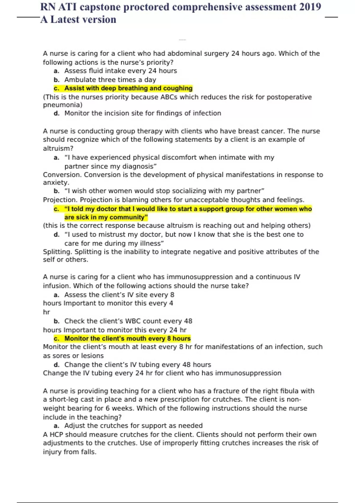 A nurse is caring for a client who had abdominal surgery 24 hours ago. Which of the following actions is the nurse’s priority? a. Assess fluid intake every 24 hours b. Ambulate three times a day c. Assist with deep breathing and coughing (This is the nurses priority because ABCs which reduces the risk for postoperative pneumonia) d. Monitor the incision site for findings of infection A nurse is conducting group therapy with clients who have breast cancer. The nurse should recognize which of the following statements by a client is an example of altruism? a. “I have experienced physical discomfort when intimate with my partner since my diagnosis” Conversion. Conversion is the development of physical manifestations in response to anxiety. b. “I wish other women would stop socializing with my partner” Projection. Projection is blaming others for unacceptable thoughts and feelings. c. “I told my doctor that I would like to start a support group for other women who are sick in my community” (this is the correct response because altruism is reaching out and helping others) d. “I used to mistrust my doctor, but now I know that she is the best one to care for me during my illness” Splitting. Splitting is the inability to integrate negative and positive attributes of the self or others. A nurse is caring for a client who has immunosuppression and a continuous IV infusion. Which of the following actions should the nurse take? a. Assess the client’s IV site every 8 hours Important to monitor this every 4 hr b. Check the client’s WBC count every 48 hours Important to monitor this every 24 hr c. Monitor the client’s mouth every 8 hours Monitor the client’s mouth at least every 8 hr for manifestations of an infection, such as sores or lesions d. Change the client’s IV tubing every 48 hours Change the IV tubing every 24 hr for client who has immunosuppression A nurse is providing teaching for a client who has a fracture of the right fibula with a short-leg cast in place and a new prescription for crutches. The client is non-weight bearing for 6 weeks. Which of the following instructions should the nurse include in the teaching? a. Adjust the crutches for support as needed A HCP should measure crutches for the client. Clients should not perform their own adjustments to the crutches. Use of improperly fitting crutches increases the risk of injury from falls. b. Use a three-point gait A three-point crutch gait allows the client to be mobile without bearing weight on the affected extremity c. Wear leather soled shoes The client should wear rubber-soled shoes when using crutches. The client who wears leather- soled shoes has an increased risk of slipping and falling. d. Advance the affected leg first when walking upstairs When walking upstairs, the client should advance the unaffected leg first. When walking downstairs, the client should advance the crutches and the affected leg first and then follow with the unaffected leg. A nurse is preparing to initiate IV access for an older adult client. Which of the following sites should the nurse select when initiating the IV for this client? a. Radial vein of the inner arm This site will have adequate subcutaneous tissue b. Great saphenous vein of the leg This can interfere with the performance of ADLs c. Dorsal plexus vein of the foot Veins and vessels in extremities are fragile in older adult clients d. Basilic vein of the hand Older adults can have skin that tears easily and can also experience a decreasein subcutaneous tissue in locations such as hands A nurse is planning to delegate client care tasks to an assistive personnel (AP). Which of the following tasks should the nurse plan to delegate to the AP? a. Perform gastrostomy feedings through a client’s established gastrostomy tube The nurse should delegate providing gastrostomy feedings through the client’s established gastrostomy tube to an AP because this task is within the AP’s range of function b. Determine if the PRN pain medication administered 30 min ago has helped RN c. Provide instructions about client care to a family member over the telephone RN d. Teach a client how to measure their own blood pressure RN A nurse is providing education to the parent of a school-age child who has asthma. Which of the following statements by the parent indicates an understanding of the teaching? a. I will administer aspirin to my child to treat pain or fever b. I will record an average of three readings from my child’s peak expiratory flow meter Parent should record highest of three readings rather than average c. I will place carpet in my child’s bedroom to control allergens d. I will make sure my child receives a yearly influenza immunization Type 1 diabetes is a contraindiciation for receiving cold therapy. A client who has type 1 diabetes can have impaired circulation due to arteriosclerosis and a loss of sensory perception due to neuropathy. Ice can further impair circulation. A nurse is providing discharge teaching to a client who is to receive home oxygen therapy. Which of the following instructions should the nurse include in the teaching? a. Check the functioning of oxygen equipment once each week This should be done daily b. Wear clothing made with cotton fabrics while oxygen is in use Cotton fabrics should be used rather than synthetic or woolen fabrics. c. Apply petroleum-based lubricant to the nares as needed d. Store full oxygen tanks on their side