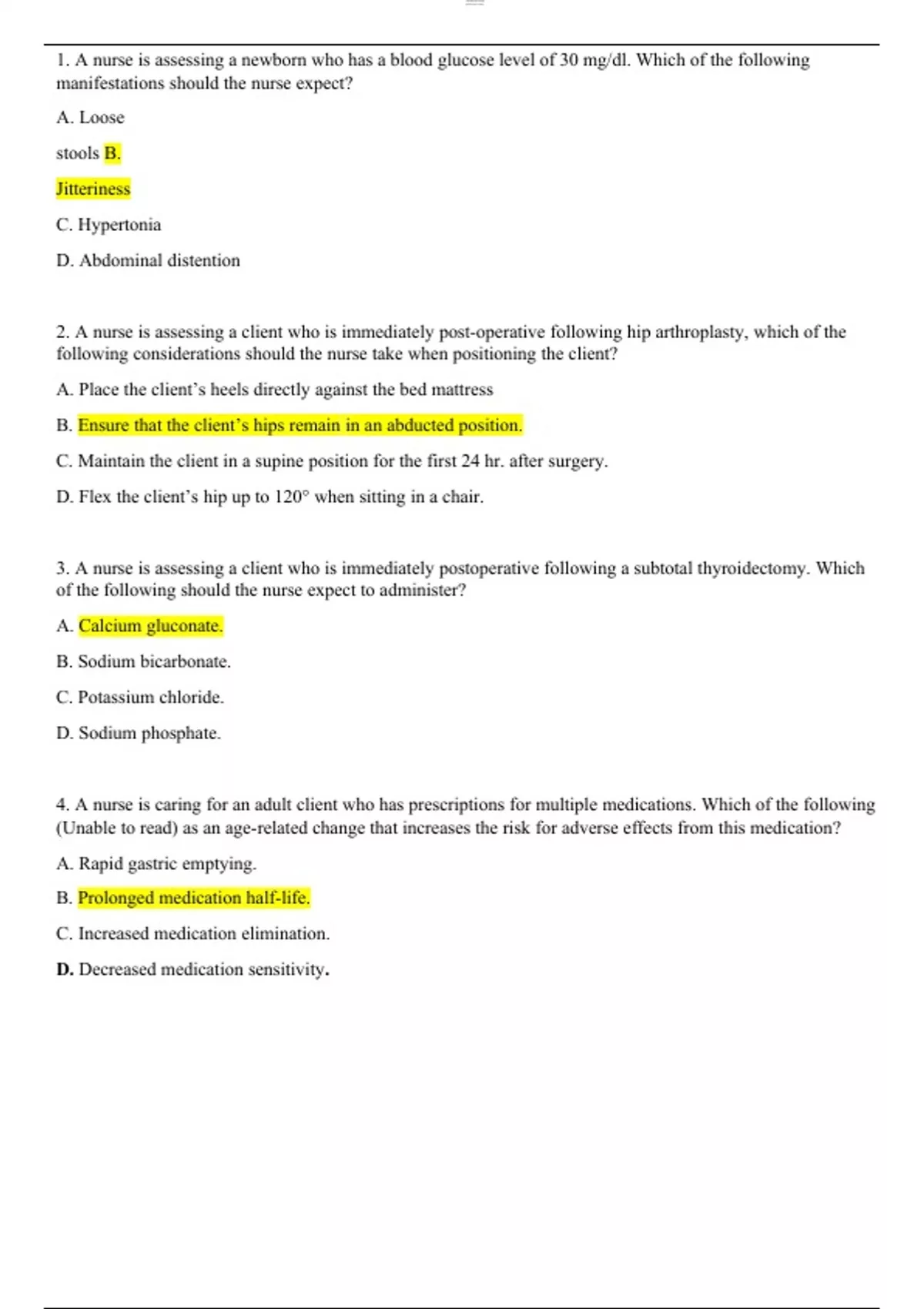 1. A nurse is assessing a newborn who has a blood glucose level of 30 mg/dl. Which of the following manifestations should the nurse expect? A. Loose stools B. Jitteriness C. Hypertonia D. Abdominal distention 2. A nurse is assessing a client who is immediately post-operative following hip arthroplasty, which of the following considerations should the nurse take when positioning the client? A. Place the client’s heels directly against the bed mattress B. Ensure that the client’s hips remain in an abducted position. C. Maintain the client in a supine position for the first 24 hr. after surgery. D. Flex the client’s hip up to 120° when sitting in a chair. 3. A nurse is assessing a client who is immediately postoperative following a subtotal thyroidectomy. Which of the following should the nurse expect to administer? A. Calcium gluconate. B. Sodium bicarbonate. C. Potassium chloride. D. Sodium phosphate. 4. A nurse is caring for an adult client who has prescriptions for multiple medications. Which of the following (Unable to read) as an age-related change that increases the risk for adverse effects from this medication? A. Rapid gastric emptying. B. Prolonged medication half-life. C. Increased medication elimination. D. Decreased medication sensitivity. 5. A nurse manager is planning to promote client advocacy among staff in a medical unit. Which of the following actions should the nurse take? A. Encourage staff to implement the principle of paternalism when a client is having difficulty making a choice. B. Tell staff explain procedures to clients before obtaining informed consent. C. Instruct unit staff to share personal experiences to help clients make decisions. D. Develop a system for staff members to report safety concerns in the client care environment. 6. C 7. A nurse is providing teaching about the gastrostomy tube feedings to the parents of a school age child. Which of the following instructions should the nurse take? A. Administer the feeding over 30 min. B. Place the child in as supine position after the feeding. C. Charge the feeding bag and tubing every 3 days. D. Warm the formula in the microwave prior to administration. 8. A nurse is administering digoxin 0.125 mg Po to an adult client. For which of the following findings should the nurse report to the provider? A. Potassium level 4.2 mEq/L. B. Apical pulse 58/min. C. Digoxin level 1 ng/ml. D. Constipation for 2 days. 9. A 10.A nurse is caring for an adolescent who has sickle-cell anemia. Which of the following manifestations indicates acute chest syndrome and should be immediately reported to the provider? A. Substernal retractions. B. Hematuria. C. Temperature 37.9 C (100.2 F). D. Sneezing. 11. C 12. A nurse is preforming a gastric lavage for a client who has upper gastrointestinal bleeding. Which of the following action should the nurse take? A. Instill 500 ml of solution through the NG tube. B. Insert a large-bore NG tube. C. Use a cold irrigation solution. D. Instruct the client to lie on his right side. 13. A nurse is providing care for a client who is in the advance stage of amyotrophic lateral sclerosis. (ALS). Which of the following referrals is the nurse’s priority? A. Psychologist. B. Social worker. C. Occupational therapist. D. Speech-language pathologist. 14.A nurse is reviewing the laboratory results of a client who has rheumatoid arthritis. Which of the following findings should the nurse report to the provider? A. WBC count 8,000/mm3. B. Platelets 150,000/mm3. C. Aspartate aminotransferase 10 units/L. D. Erythrocyte sedimentation rate 75 mm/hr 15. A nurse is caring for a client who has generalized petechiae and ecchymoses. The nurse should expect a prescription for which of the following laboratory tests? A. Platelet count. B. Potassium level. C. Creatine clearance. D. Prealbumin.