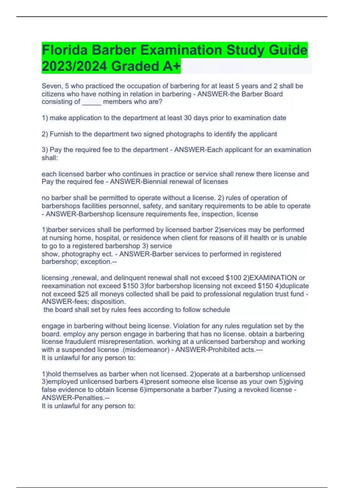 Florida Barber Examination Study Guide 2023/2024 Graded A+
