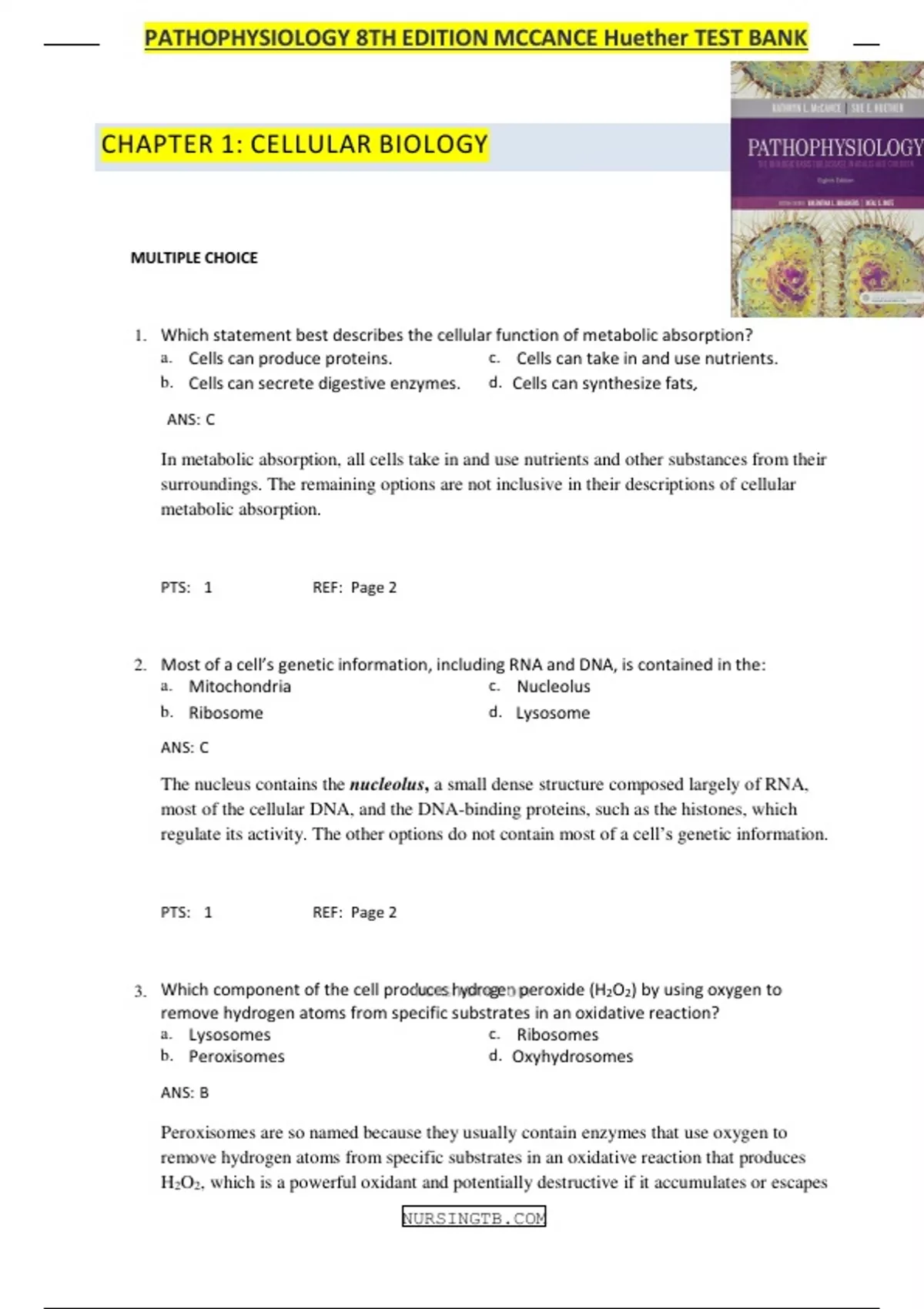 TEST BANK PATHOPHYSIOLOGY THE BIOLOGICAL BASIS FOR DISEASE IN ADULTS AND CHILDREN 8TH EDITION MCCANCE, HUETHER Chapter 1: Cellular Biology MULTIPLE CHOICE 1. Which statement best describes the cellular function of metabolic absorption? a. Cells can produce proteins. c. Cells can take in and us...