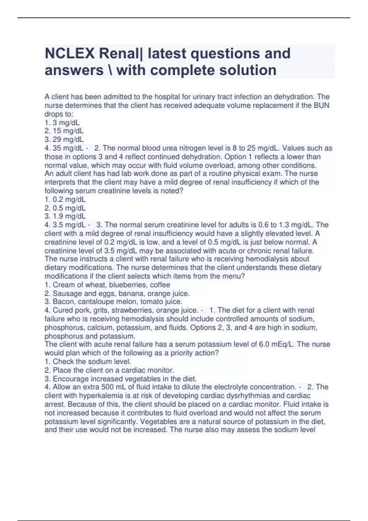 NCLEX Renal| latest questions and answers with complete solution A client has been admitted to the hospital for urinary tract infection an dehydration. The nurse determines that the client has received adequate volume replacement if the BUN drops to: 1. 3 mg/dL 2. 15 mg/dL 3. 29 mg/dL 4. 35 mg/dL - 2. The normal blood urea nitrogen level is 8 to 25 mg/dL. Values such as those in options 3 and 4 reflect continued dehydration. Option 1 reflects a lower than normal value, which may occur with fluid volume overload, among other conditions. An adult client has had lab work done as part of a routine physical exam. The nurse interprets that the client may have a mild degree of renal insufficiency if which of the following serum creatinine levels is noted? 1. 0.2 mg/dL 2. 0.5 mg/dL 3. 1.9 mg/dL 4. 3.5 mg/dL - 3. The normal serum creatinine level for adults is 0.6 to 1.3 mg/dL. The client with a mild degree of renal insufficiency would have a slightly elevated level. A creatinine level of 0.2 mg/dL is low, and a level of 0.5 mg/dL is just below normal. A creatinine level of 3.5 mg/dL may be associated with acute or chronic renal failure. The nurse instructs a client with renal failure who is receiving hemodialysis about dietary modifications. The nurse determines that the client understands these dietary modifications if the client selects which items from the menu? 1. Cream of wheat, blueberries, coffee 2. Sausage and eggs, banana, orange juice. 3. Bacon, cantaloupe melon, tomato juice. 4. Cured pork, grits, strawberries, orange juice. - 1. The diet for a client with renal failure who is receiving hemodialysis should include controlled amounts of sodium, phosphorus, calcium, potassium, and fluids. Options 2, 3, and 4 are high in sodium, phosphorus and potassium. The client with acute renal failure has a serum potassium level of 6.0 mEq/L. The nurse would plan which of the following as a priority action? 1. Check the sodium level. 2. Place the client on a cardiac monitor. 3. Encourage increased vegetables in the diet. 4. Allow an extra 500 mL of fluid intake to dilute the electrolyte concentration. - 2. The client with hyperkalemia is at risk of developing cardiac dysrhythmias and cardiac arrest. Because of this, the client should be placed on a cardiac monitor. Fluid intake is not increased because it contributes to fluid overload and would not affect the serum potassium level significantly. Vegetables are a natural source of potassium in the diet, and their use would not be increased. The nurse also may assess the sodium level because sodium is another electrolyte commonly measured with the potassium level. However, this is not a priority action of the nurse. The client