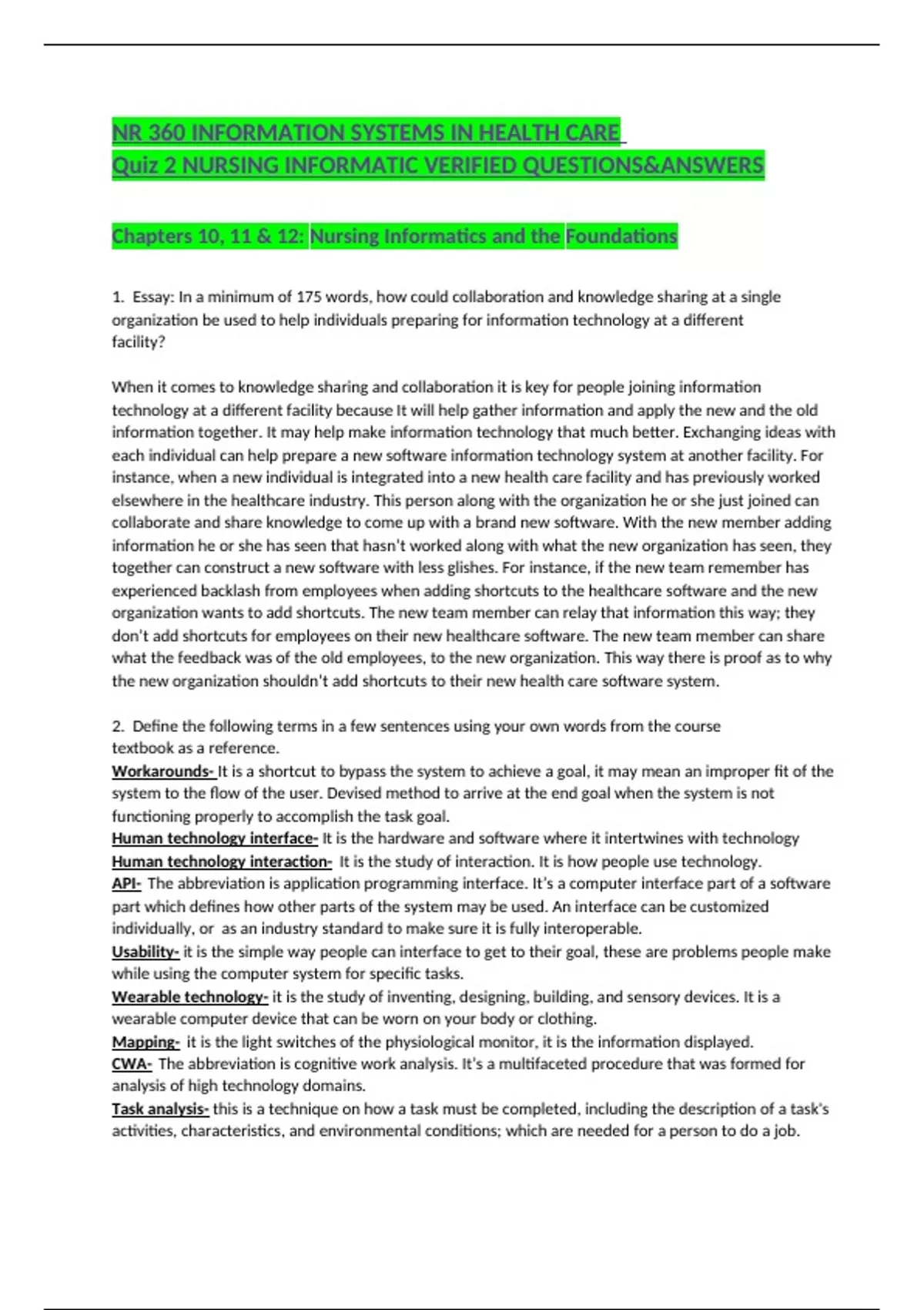 NR 360 INFORMATION SYSTEMS IN HEALTH CARE Quiz 2 NURSING INFORMATIC