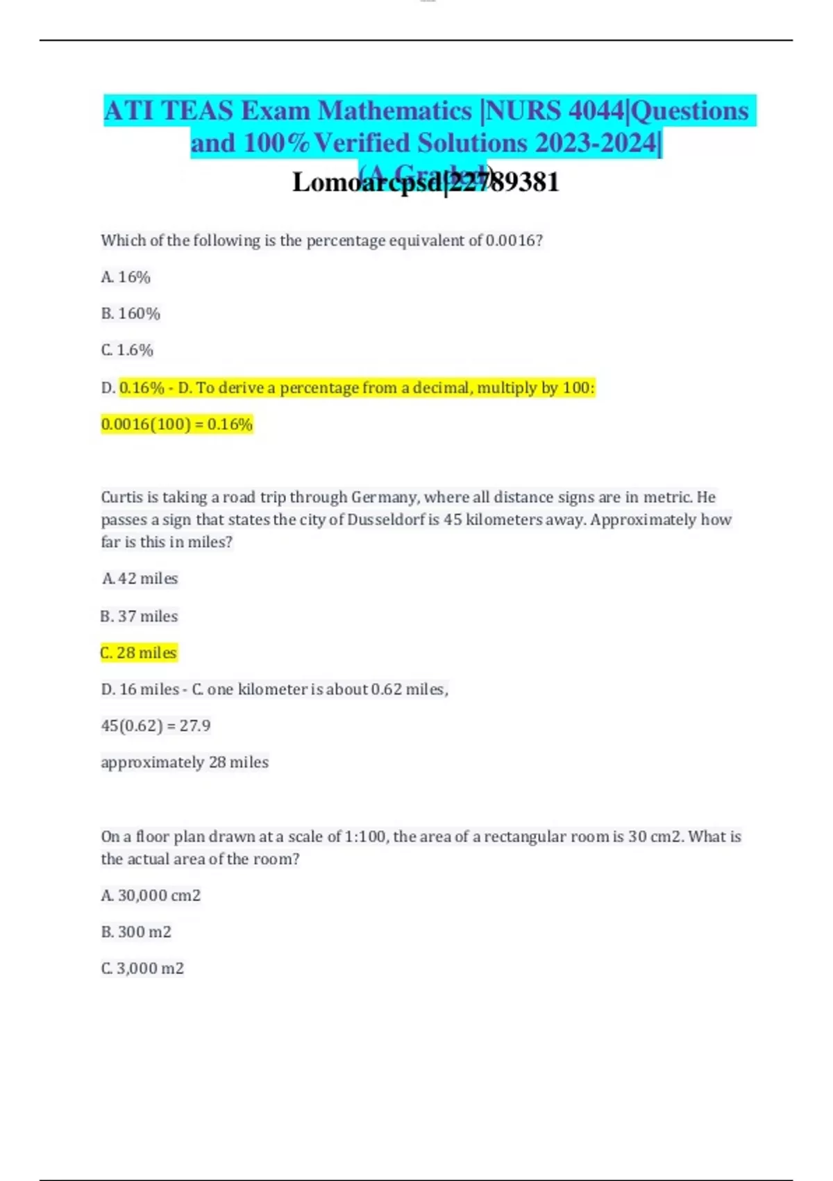 ATI TEAS Exam Mathematics |NURS 4044|Questions and 100%Verified Solutions | Lomoarcpsd|22789