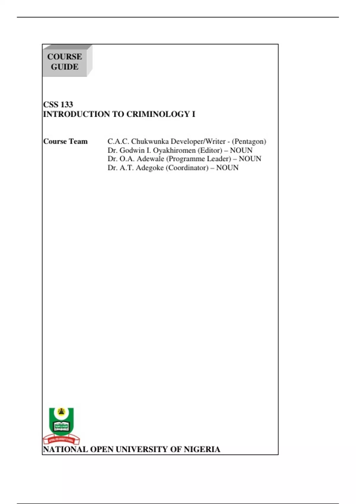 INTRODUCTION Welcome to CSS133: Introduction to Criminology 1. This course is a two-credit unit course for all students of Criminology and Security Studies. The course is suitable for beginners as a foundation course on the subject matter of knowing the relationship between crime and society; treatment of offenders and prevention and control of crimes. This course guide gives you an overview of the course. It also provides you with information on the organisation and requirements of the course. In other words, it enables you to know what the course is all about, what you ought to know in each unit, what course material one needs to use and how you can work your way through this course. COURSE AIM The basic aim of CSS133: Introduction to Criminology 1 is to expose the learner to the rudiments of criminal explanations. This broad aim will be consummated through the: (i) dimensions of criminology (ii) classical and contemporary theories of criminology (iii) constitutional factors that cause crimes (iv) reason some people commit crime and others do not (v) treatment of offenders and victims of crime and measurement of crimes. COURSE OBJECTIVES In each of the units, we have specific objectives. It is advisable for students to go through these objectives before reading through the unit. In doing this, you are sure that you have covered the prerequisites of that unit. To achieve the aims set out in CSS 133: Introduction to Criminology 1, the objectives for the course as a whole would be emphasised. On successful completion of the course, the learner should be able to: a. define criminology b. establish the dimensions of criminology c. distinguish the different schools of thought • discuss the classical schools • explain the positivist ideology CSS133 COURSE GUIDE v • explain the critical school of thought • discuss the sociological model of reasoning and • explain the new criminology (d) state the theoretical explanation of crimes (e) define the relevant terms (f) identify the etiology of crimes (g) outline the elements and classifications of crime (h) discuss crime as a societal phenomenon (i) distinguish between conformity and deviance; and the impact of labeling (j) evaluate the measurement of crimes (k) critique the juridical approach to crimes, and the treatment of offenders and victims.