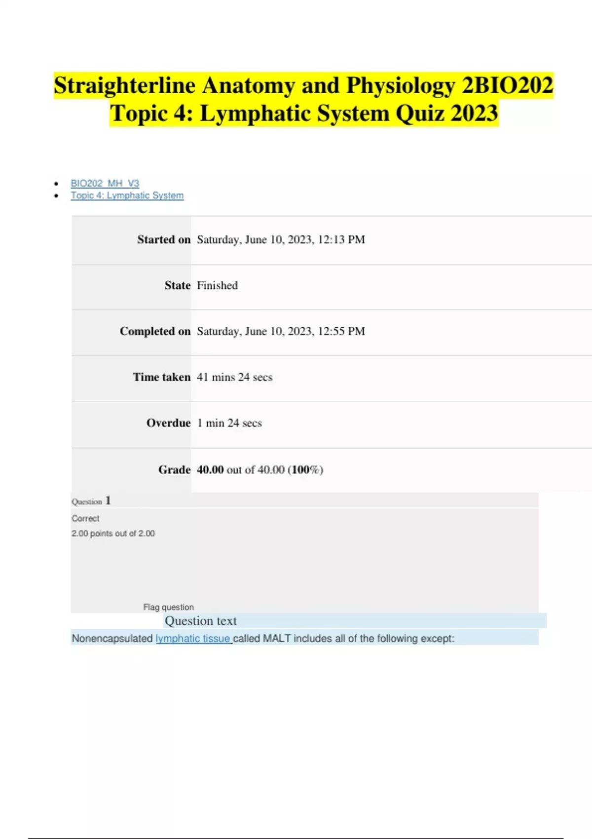 Straighterline Anatomy and Physiology 2BIO202 Topic 4: Lymphatic System Quiz 2023
