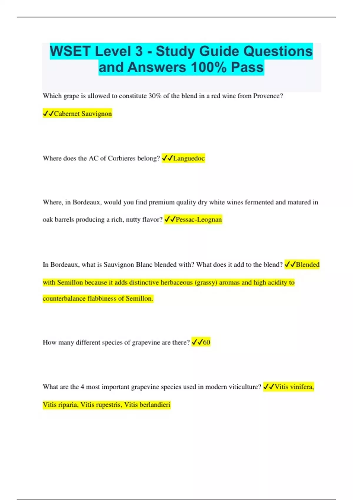 WSET Level 3 - Study Guide Questions and Answers 100% Pass Which grape is allowed to constitute 30% of the blend in a red wine from Provence? Cabernet Sauvignon Where does the AC of Corbieres belong? Languedoc Where, in Bordeaux, would you find premium quality dry white wines fermented and matured in oak barrels producing a rich, nutty flavor? Pessac-Leognan In Bordeaux, what is Sauvignon Blanc blended with? What does it add to the blend? Blended with Semillon because it adds distinctive herbaceous (grassy) aromas and high acidity to counterbalance flabbiness of Semillon. How many different species of grapevine are there? 60 What are the 4 most important grapevine species used in modern viticulture? Vitis vinifera, Vitis riparia, Vitis rupestris, Vitis berlandieri What is the main Eurasian grapevine species? Vitis Vinifera How long has Vitis Vinifera been used in winemaking? Several thousand years How many varieties of Vitis Vinifera are there? 5,000-10,000 What are the main North American grapevine species? Vitis riparia, Vitis rupestris, Vitis berlandieri Which North American grapevine variety is used in winemaking? None Why is "pure" Vitis Vinifera an inferior grapevine? It is not resistant to Phylloxera. What techniques can be used to make Vitis Vinifera resistant to Phylloxera? Grafting of rootstock What is a shoot? The new growth a vine produces each year. Where can you find "nodes"? Along the length of each shoot What is contained at each node? A leaf and a flower OR leaf and a tendril Where do buds form? Where leaf stems join the shoot. What are the grapevine's "engine"? The leaves What are leaves responsible for? Explain. Photosynthesis, which is the process by which plants use chlorophyll and energy to convert water and CO2 into sugar glucose and oxygen. What are the three primary uses of the glucose produced in photosynthesis? 1) Combining small glucose molecules into larger carbohydrates creating the building blocks for all structures 2) Energy stored in glucose can be released when needed for other living processes 3) Concentrated in the fruit, to make them attractive to the animals, needed to propagate seeds What are tendrils? Structure vines used to grip a supporting structure What do tendrils do? Once they sense a supporting structure, they wind tightly around it to keep the shoot upright What is the importance of flowers on a grapevine? It is the plant's reproductive organ What type of reproductive organs do flowers on the grapevine contain? Both female and male What are inflorescences? Bunches of flowers What does a flower that is successfully pollinated become? A berry and the inflorescence will be come a bunch of grapes How does pollination of the grapevine happen? Wind or animals What is an embryonic shoot? A bud found between the leaf and shoot Where does a bud mature? Inside their casing during the growing season What does a bud look like at the end of the growing season? A miniature version of all the structures that will become the shoot, leaves, flowers, and tendrils in the following year What is one year old wood? When is it formed? Shoots that have turned woody during the winter after they have grown Why is it important to manage the one year old wood? Because vines will normally only produce fruit on shoots that grow from buds that developed the previous year How is one year old wood cared for? Every winter the vine is pruned What is a cane? Long one year old wood containing 8-15 buds What is a spur? Short one year old wood containing 2-3 buds What is permanent wood? Wood which is more than 1 year old How is the amount of permanent wood restricted in the vineyard? Pruning What is permanent wood made up of? Trunk and