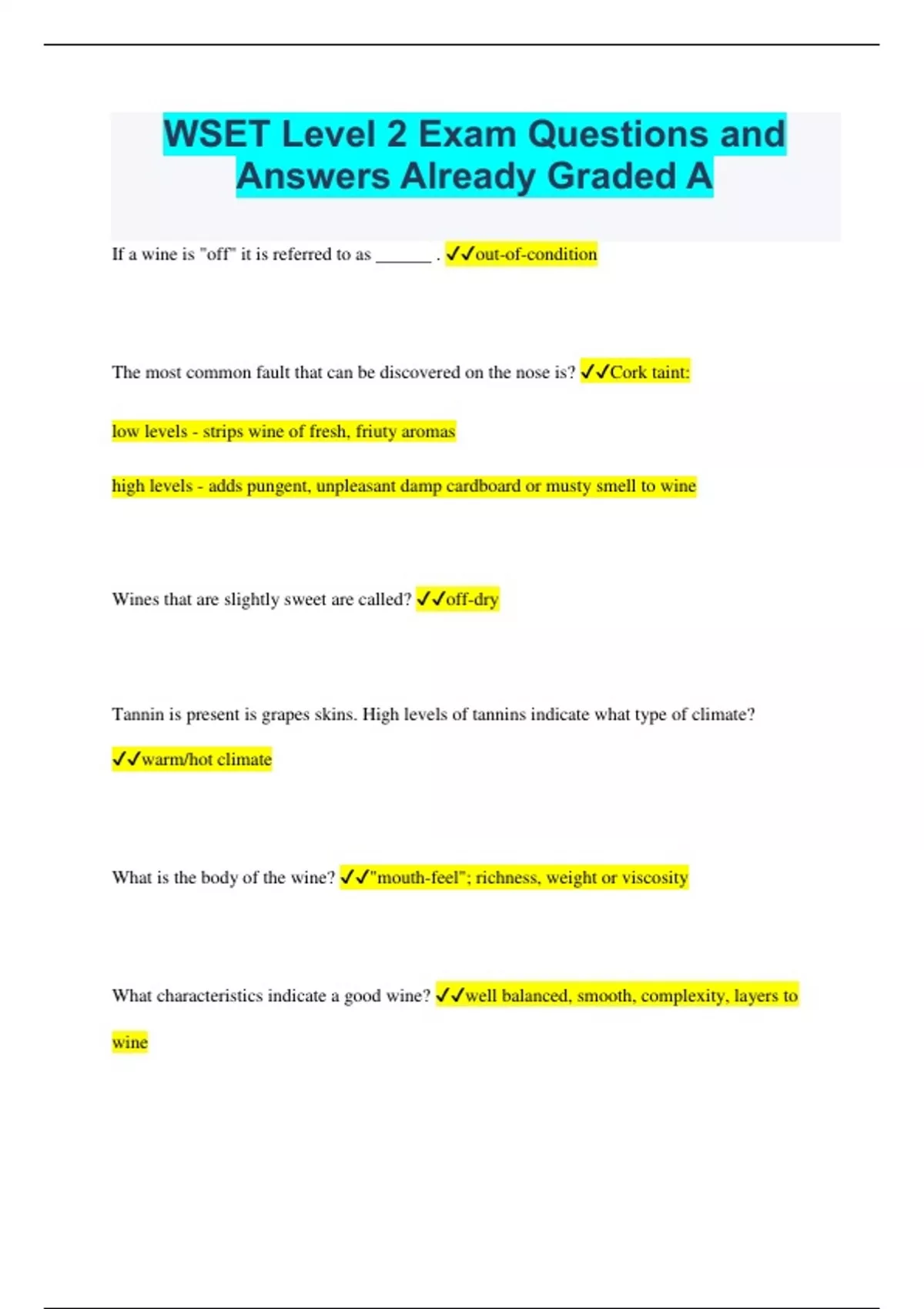 WSET Level 2 Exam Questions and Answers Already Graded A If a wine is "off" it is referred to as ______ . out-of-condition The most common fault that can be discovered on the nose is? Cork taint: low levels - strips wine of fresh, friuty aromas high levels - adds pungent, unpleasant damp cardboard or musty smell to wine Wines that are slightly sweet are called? off-dry Tannin is present is grapes skins. High levels of tannins indicate what type of climate? warm/hot climate What is the body of the wine? "mouth-feel"; richness, weight or viscosity What characteristics indicate a good wine? well balanced, smooth, complexity, layers to wine What wine would match a rich heavyweight food? full-bodied wines. Preferably red wine, but full-bodied white can go well What does a wine need to match tomatoes, olive oil and vinegar? high acidity If you have a dry wine with a dessert what happens to the wine? it will seem tart and over-acidic What component in wine is a good match with protein? wines with high levels of tannin In order to grow a vine needs: a, b, c, d, e a. Carbon dioxide (CO2) b. Sunlight c. Water d. Warmth e. Nutrients What affects the style and quality of wine each year? Climate; weather conditions vary from year to year What are four vineyard activies? 1. careful pruning 2. controlling the number of bunches of grapes on each vine 3. pest control 4. careful positioning of leaves to increase or decrease temperature of grape bunches, or their degree of exposure to sunlight Lower yields result in ________ grapes riper; with more concentrated flavors What are two pests in the vineyard? Animal pests (birds & insects) Fungal diseases (long-term diseases caused by fungi, bacteria, or viruses When does harvesting occur? once the grapes have ripened. End of September or end of August if it's a good summer White wines and red wines are both crushed but what extra step happens to white wines after they have been crushed? they are pressed to separate juice from skins What temperature does white wine get fermented at? 12-22 Celsius (53.6-71.6 Fahrenheit): preserves delicate fruit aromas What temperature does red wine get fermented at? 20-32 Celsius (68-89.6 Fahrenheit) What vessels can wine mature in? barrels or large neutral wooden or stainless steel vats, concrete. Also takes place in bottle after bottling What vessels allow oxidation? new and old vats or barrels (oak) What vessels do not allow oxidation? bottles, cement, and stainless steel vats What does vintage mean? the year the grapes were harvested The European Union divides its wine into 2 categories that are: a. wines with a geographical location (GI) b. wines without State traditional terms for Protected Denomination of Origin (PDO) for each country: a. France b. Italy c. Spain d. Germany a. Appellation d'Origine Controlee (AOC) b. Denominazione di Origine Controllata (DOC) Denominazione di Origine Controllata e Garanita (DOCG) c. Denominacion de Origen (DO) Denominacion de Origen Calificada (DOCa) d. Qualitatswein Pradikatswein Look at the following label and state the following: see #26 in study guide a. Country b. Region c. Chateau d. Vintage e. Quality Level Cabernet Sauvignon a. France b. Bordeaux c. Haut Batailley d. 2000 e. PDO