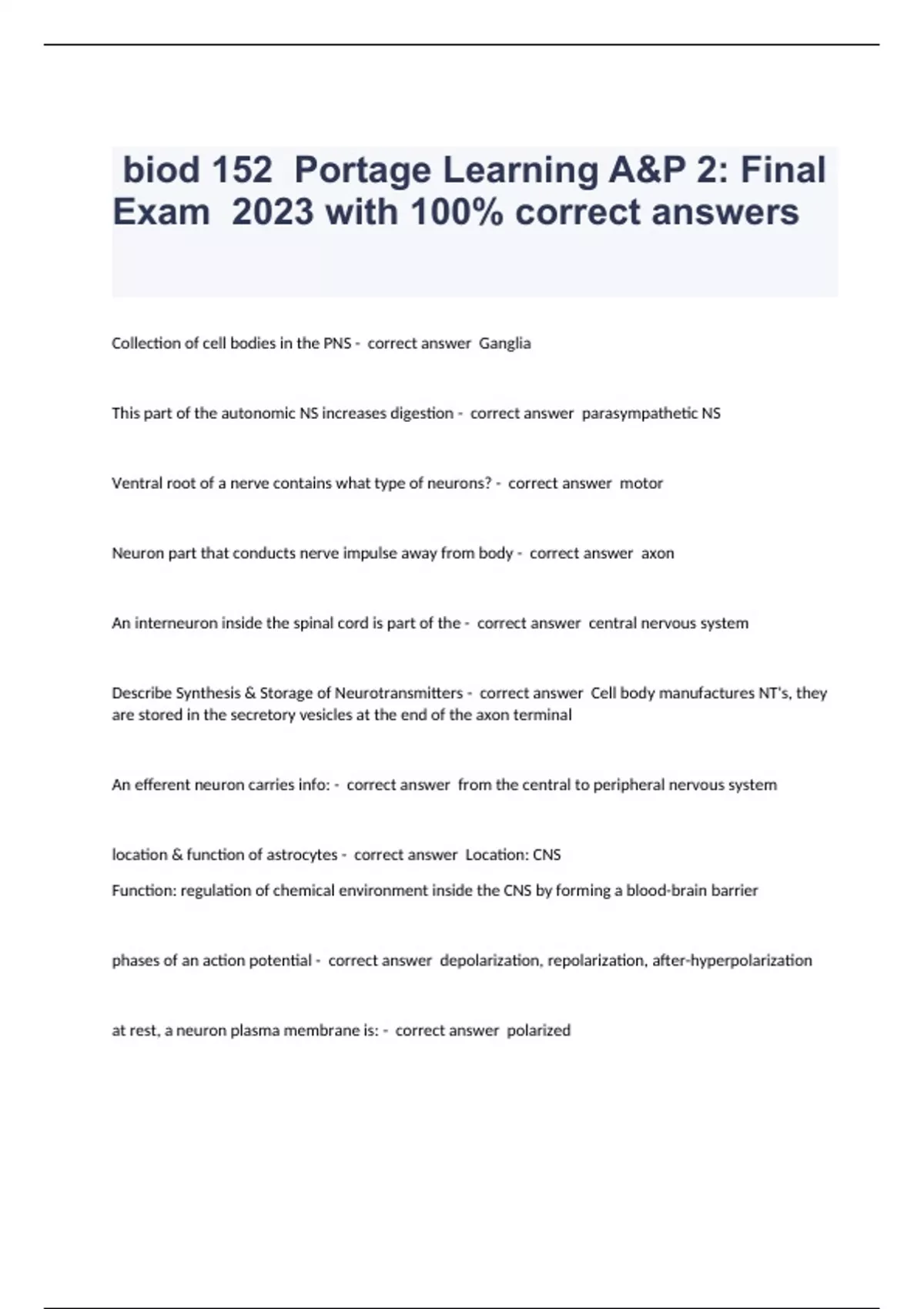 biod 152 Portage Learning A&P 2: Final Exam 2023 with 100% correct answers