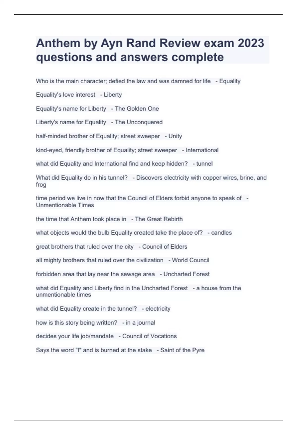 Anthem by Ayn Rand Review exam 2023 questions and answers complete