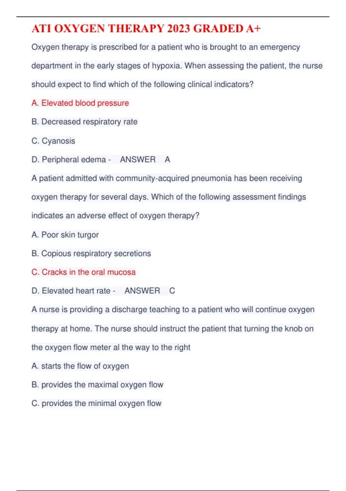 Oxygen therapy is prescribed for a patient who is brought to an emergency department in the early stages of hypoxia. When assessing the patient, the nurse should expect to find which of the following clinical indicators? A. Elevated blood pressure B. Decreased respiratory rate C. Cyanosis D. Peripheral edema - ANSWER A A patient admitted with community-acquired pneumonia has been receiving oxygen therapy for several days. Which of the following assessment findings indicates an adverse effect of oxygen therapy? A. Poor skin turgor B. Copious respiratory secretions C. Cracks in the oral mucosa D. Elevated heart rate - ANSWER C A nurse is providing a discharge teaching to a patient who will continue oxygen therapy at home. The nurse should instruct the patient that turning the knob on the oxygen flow meter al the way to the right A. starts the flow of oxygen B. provides the maximal oxygen flow C. provides the minimal oxygen flow