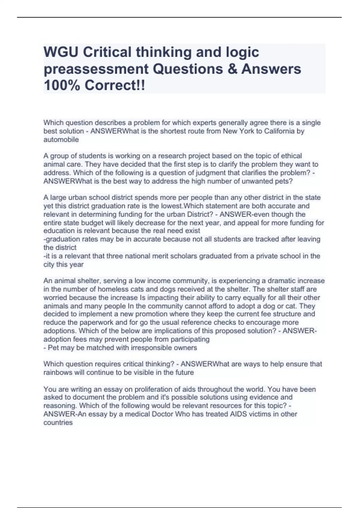 Which question describes a problem for which experts generally agree there is a single best solution - ANSWERWhat is the shortest route from New York to California by automobile A group of students is working on a research project based on the topic of ethical animal care. They have decided that the first step is to clarify the problem they want to address. Which of the following is a question of judgment that clarifies the problem? - ANSWERWhat is the best way to address the high number of unwanted pets? A large urban school district spends more per people than any other district in the state yet this district graduation rate is the lowest.Which statement are both accurate and relevant in determining funding for the urban District? - ANSWER-even though the entire state budget will likely decrease for the next year, and appeal for more funding for education is relevant because the real need exist -graduation rates may be in accurate because not all students are tracked after leaving the district -it is a relevant that three national merit scholars graduated from a private school in the city this year An animal shelter, serving a low income community, is experiencing a dramatic increase in the number of homeless cats and dogs received at the shelter. The shelter staff are worried because the increase Is impacting their ability to carry equally for all their other animals and many people In the community cannot afford to adopt a dog or cat. They decided to implement a new promotion where they keep the current fee structure and reduce the paperwork and for go the usual reference checks to encourage more adoptions. Which of the below are implications of this proposed solution? - ANSWER-adoption fees may prevent people from participating - Pet may be matched with irresponsible owners Which question requires critical thinking? - ANSWERWhat are ways to help ensure that rainbows will continue to be visible in the future You are writing an essay on proliferation of aids throughout the world. You have been asked to document the problem and it's possible solutions using evidence and reasoning. Which of the following would be relevant resources for this topic? - ANSWER-An essay by a medical Doctor Who has treated AIDS victims in other countries -A
