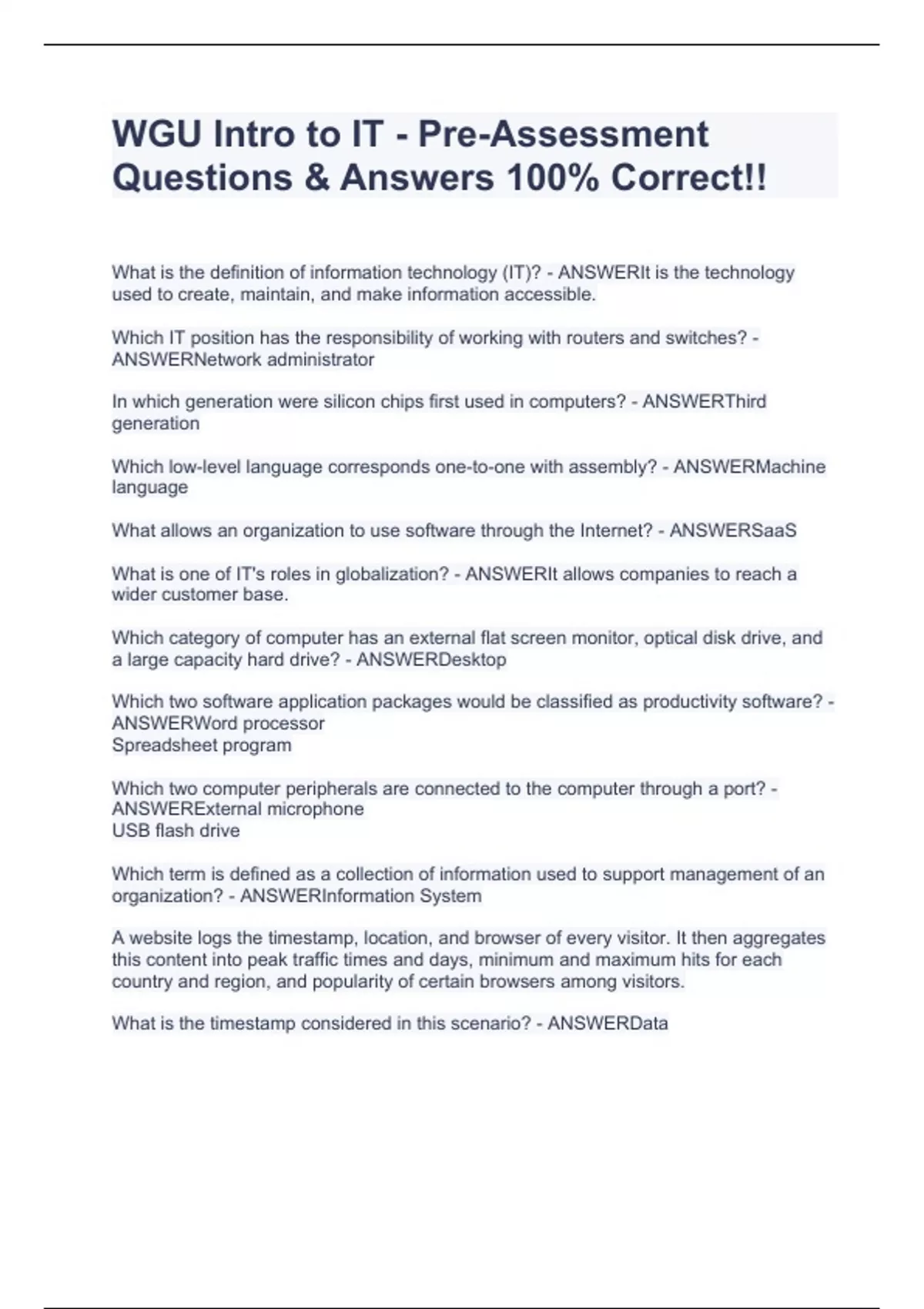 WGU Intro to IT - Pre-Assessment Questions & Answers 100% Correct!!