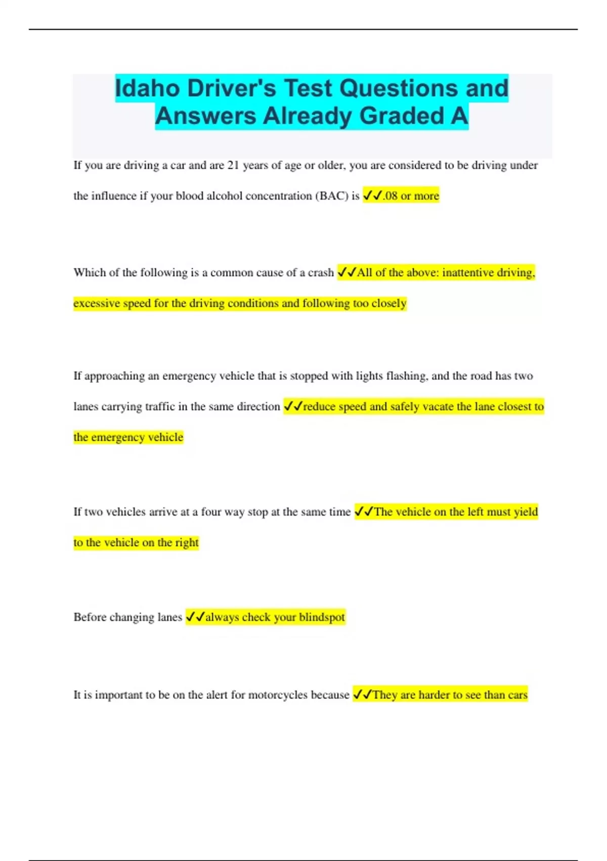 Idaho Driver's Test Questions and Answers Already Graded A If you are driving a car and are 21 years of age or older, you are considered to be driving under the influence if your blood alcohol concentration (BAC) is .08 or more Which of the following is a common cause of a crash All of the above: inattentive driving, excessive speed for the driving conditions and following too closely If approaching an emergency vehicle that is stopped with lights flashing, and the road has two lanes carrying traffic in the same direction reduce speed and safely vacate the lane closest to the emergency vehicle If two vehicles arrive at a four way stop at the same time The vehicle on the left must yield to the vehicle on the right Before changing lanes always check your blindspot It is important to be on the alert for motorcycles because They are harder to see than cars To drive more safely at night All of the above; increase following distance, don't drive when you're tired, and make sure your headlights are working properly When you park parallel to a curb or edge of roadway You must park within 18 inches of the curb or edge of roadway In what situation is it legal to pass a vehicle on the right as long as you don't leave the road If you are on a two-lane, two way road and the vehicle you are overtaking is turning left Motor vehicles must yield to pedestrians When the pedestrian is in a crosswalk at an intersection Railroad crossings should always be considered dangerous When making a left turn Yield to oncoming traffic, unless otherwise directed by a traffic signal The best way to avoid hydroplaning is All of the above; Keep your tires properly maintained, slow down when roads are wet or slushy and watch out for standing water or puddles right turn not permitted What does this sign mean intersection/crossroad This road sign means You do not have to stop for a school bus if You are traveling in the opposite direction on roadways with four or more lanes with two lanes going in each direction What is Idaho's "basic rule" law for driving speed Drive at a speed that is "reasonable and prudent" at all times The best way to deal with tailgating is to change lines when possible or gradually slow down to encourage them to pass Which of the following is correct You may turn right after stopping at a steady red light and yielding to cross traffic-unless otherwise posted In which of the following ways can drinking alcoholic beverages affect you All of the above: slows your reaction time, gives you a feeling of false confidence, and impairs your thinking ability Which of the following is the best thing to do before backing a car out of a driveway Check behind the vehicle before you get in In Idaho, which of the following rules apply to bicyclists Bicyclists must yield right-of-way to vehicles in or already at the intersection To avoid crashes with vehicles in your "blind spots" quickly turn your head to see if your blindspot is clear before changing lanes Use of cell phones while driving can distract you and cause a crash It is important to make a reasonable effort to notify the owner of another vehicle if you hit their vehicle while it is unattended When approaching a curve on a narrow road where the view is obstructed it is best to Sound the horn and stay close to the right edge of the road while proceeding carefully What is the correct response for dealing with emergency vehicles approaching from behind with lights flashing Immediately pull to the nearest curb or edge of roadway and stop When following other vehicles, maintain a space cushion of at least three seconds When merging onto a freeway , it is usually best to accelerate to the speed of the freeway traffic When you are on the freeway in the right lane, allow room for vehicles merging onto the freeway by safely moving into the next lane to allow them access When can you proceed through an intersection with a stop sign but no stop line or crosswalk After coming to a complete stop ensuring it is safe to proceed If the traffic signals are not functioning due to a power outage treat the intersection as a four way stop When you need to change lanes, it is important to All of the above: signal your intentions ahead of time, check your blind spot, and make sure the lane is clear before entering Approximately one-half of all motorcycle crashes involve another motor vehicle Night driving can be more difficult because your vision is reduced When parking on a hill or incline with a curb, facing uphill turn your front wheels sharply away from the curb Parking is allowed Within 25 feet of crosswalk Passing is prohibited All of the above : when you are behind a school bus that has stopped to load passengers, on hills where your vision is restricted and within 100 feet of oncoming traffic When passing other vehicles Check your mirrors and blindspot Is it legal to pass when the pavement is marked with a double yellow line no On roads with dashed white lines, they can be crossed over when it is safe to change lanes Pedestrians must yield to motor vehicles when the pedestrian is crossing the street where there is no crosswalk or intersection A person walking with a white cane or guide dog is likely to be a blind person To be safe when crossing a railroad, you should listen and look both ways and then proceed if it is safe to do so If there are two railroad tracks next to each other When one train passes, watch out for another train on the other track You must yield to other drivers When entering a street from a garage or alley If you need to drive in foggy conditions turn on your headlights to low beams Roads can be very slick under what conditions Both answers above: When it has just started raining due to oil and water creating a greasy mix and when there is moisture on the road and the temperature is at freezing or below The most common color of warning signs is yellow You must stop for a school bus If its red lights are flashing on a two-lane highway When driving thro