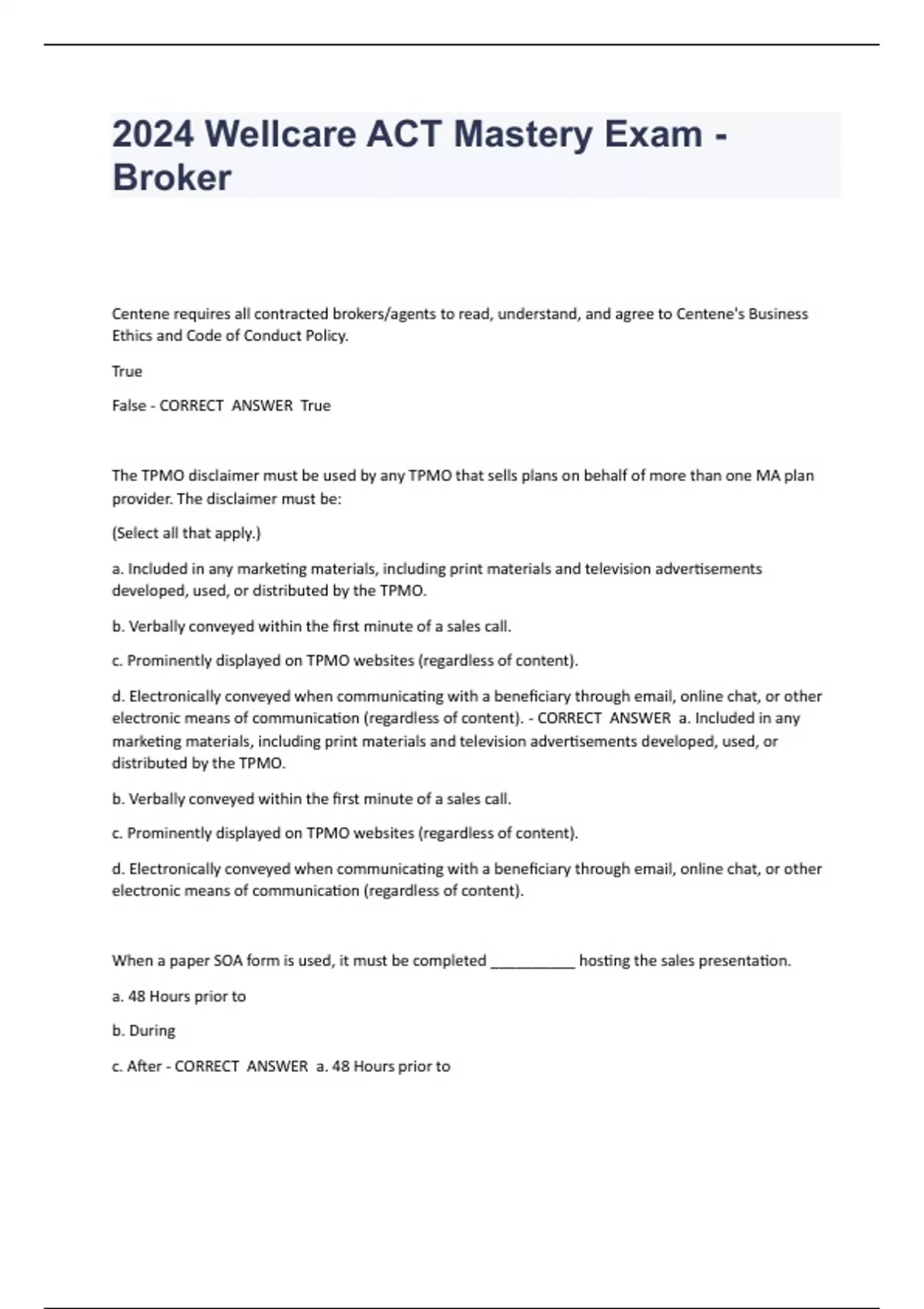 2024 Wellcare ACT Mastery Exam - Broker Centene requires all contracted brokers/agents to read, understand, and agree to Centene's Business Ethics and Code of Conduct Policy. True False - CORRECT ANSWER True The TPMO disclaimer must be us