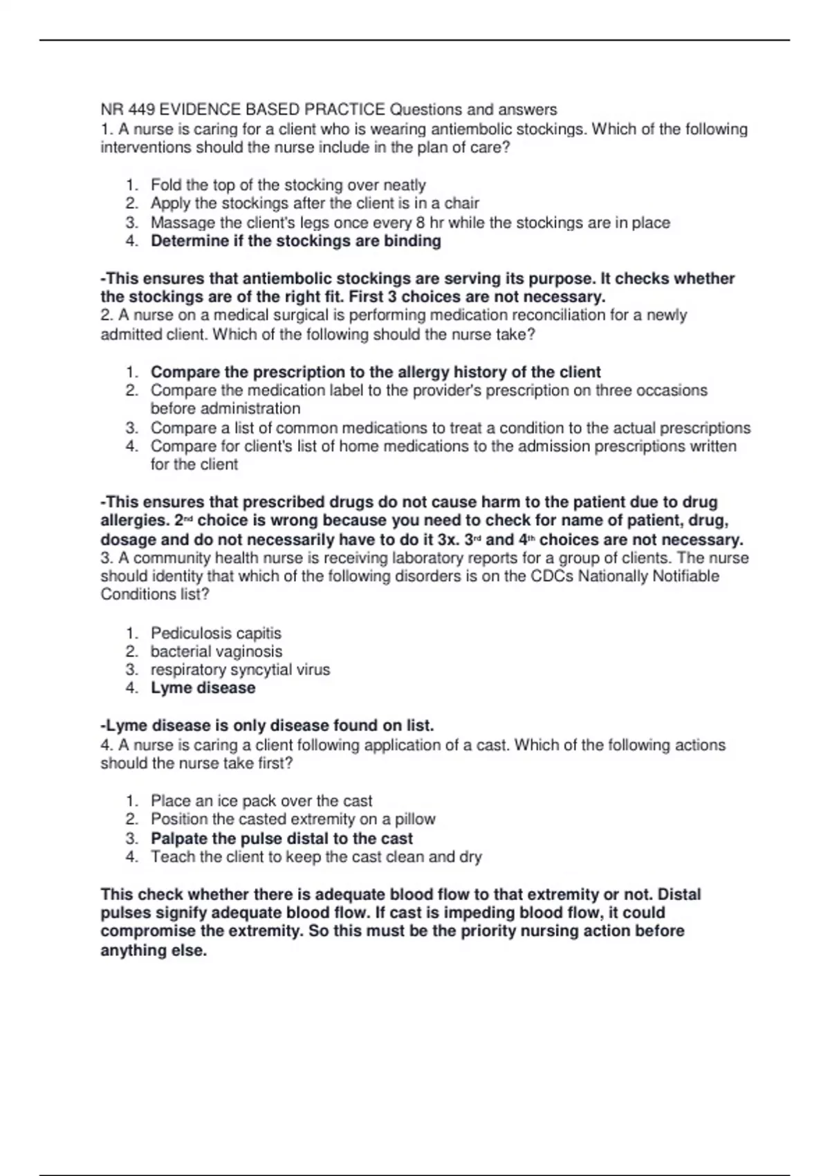 NR 449 EVIDENCE BASED PRACTICE Questions and answers 1. A nurse is caring for a client who is wearing antiembolic stockings. Which of the following interventions should the nurse include in the plan of care? 1. Fold the top of the stocking over neatly 2. Apply the stockings after the client is in a chair 3. Massage the client's legs once every 8 hr while the stockings are in place 4. Determine if the stockings are binding -This ensures that antiembolic stockings are serving its purpose. It checks whether the stockings are of the right fit. First 3 choices are not necessary. 2. A nurse on a medical surgical is performing medication reconciliation for a newly admitted client. Which of the following should the nurse take? 1. Compare the prescription to the allergy history of the client 2. Compare the medication label to the provider's prescription on three occasions before administration 3. Compare a list of common medications to treat a condition to the actual prescriptions 4. Compare for client's list of home medications to the admission prescriptions written for the client allergies. 2nd-This ensures that prescribed drugs do not cause harm to the patient due to drug choice is wrong because you need to check for name of patient, drug, dosage and do not necessarily have to do it 3x. 3rd and 4th choices are not necessary. 3. A community health nurse is receiving laboratory reports for a group of clients. The nurse should identity that which of the following disorders is on the CDCs Nationally Notifiable Conditions list? 1. Pediculosis capitis 2. bacterial vaginosis 3. respiratory syncytial virus 4. Lyme disease -Lyme disease is only disease found on list. 4. A nurse is caring a client following application of a cast. Which of the following actions should the nurse take first? 1. Place an ice pack over the cast 2. Position the casted extremity on a pillow 3. Palpate the pulse distal to the cast 4. Teach the client to keep the cast clean and dry This check whether there is adequate blood flow to that extremity or not. Distal pulses signify adequate blood flow. If cast is impeding blood flow, it could compromise the extremity. So this must be the priority nursing action before anything else. 5. A staff nurse is observing a newly licensed nurse suction a client's tracheostomy. Which of the following actions by the newly licenses nurse requires interventions by the staff nurse? 1. Applies suction for 15 seconds 2. Encourages the client to cough during suctioning 3. Wait for 2 min between suctions 4. Inserts the catheter without applying suction 1st 2nd is correct because you must suction for 10-15 seconds (so it isn't the answer) is correct because encouraging patient to cough displaces secretions towards upper airway, allowing it to be suctioned and removed, promoting clearance of airway (so it isn't the answer) 3rd is incorrect because you must allow patient to rest for 20-30 seconds but waiting 2 mins between suctions is too long. You however must always allow patient to rest between suctioning to allow them to oxygenate and rest. (the answer) 4th is correct because you must not suction while inserting catheter. This ensures proper placement and insertion of the catheter. You must insert and suction while slowly pulling it out (so it isn't the answer) 6. A nurse is working with a client who has an anxiety disorder and is in in the orientation phase of the therapeutic relationship. Which of the following statements should the nurse make during this phase? 1. Let's talk about how you can change your response to stress 2. Let me show you simple relation exercise to manage stress 3. We should establish our roles in the initial session 4. We should discuss resource to implement in your daily life 3rd is the answer because since nurse-client relationship is in orientation phase, it is important to establish and orient the patient on their roles and goals. Other choices are incorrect because they are more focused on the interventional aspect and not on the orientation phase. 7. A nurse is caring for a client who is at 11 weeks of gestation. Which of the following immunization should the nurse recommend? a. influenza b. human Papillomavirus C. Measles, mumps, and rubella d. varicella A is the answer as it is the recommended vaccine for the patient's age. B is wrong because it is usually administered/initiated at age 9-14. While C and D are also wrong because they are usually given at 12-18 months. 8. A home health nurse is preparing to make a initial visit to a family following a referral from a local provider. Identify the sequence of step the nurse should take when conducting a home visit. Placing them in the order of performance. Use all steps 1. Discus plans for future visits with the family 2. Clarify the reason for the referral with the provider's office 3. Record information about the home visit according to agency policy 4. Identify family needs and interventions using the nursing process 5. Contact the family to determine availability and readness to make an appointment