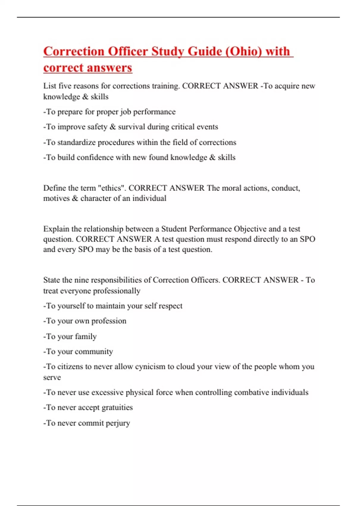 List five reasons for corrections training. CORRECT ANSWER -To acquire new knowledge & skills -To prepare for proper job performance -To improve safety & survival during critical events -To standardize procedures within the field of corrections -To build confidence with new found knowledge & skills Define the term "ethics". CORRECT ANSWER The moral actions, conduct, motives & character of an individual Explain the relationship between a Student Performance Objective and a test question. CORRECT ANSWER A test question must respond directly to an SPO and every SPO may be the basis of a test question. State the nine responsibilities of Correction Officers. CORRECT ANSWER - To treat everyone professionally -To yourself to maintain your self respect -To your own profession -To your family -To your community -To citizens to never allow cynicism to cloud your view of the people whom you serve -To never use excessive physical force when controlling combative individuals -To never accept gratuities