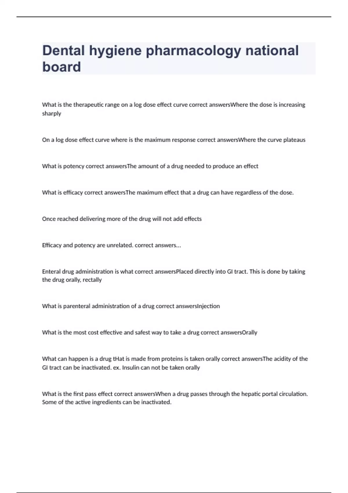 What is the therapeutic range on a log dose effect curve correct answersWhere the dose is increasing sharply On a log dose effect curve where is the maximum response correct answersWhere the curve plateaus What is potency correct answersThe amount of a drug needed to produce an effect What is efficacy correct answersThe maximum effect that a drug can have regardless of the dose. Once reached delivering more of the drug will not add effects Efficacy and potency are unrelated. correct answers... Enteral drug administration is what correct answersPlaced directly into GI tract. This is done by taking the drug orally, rectally What is parenteral administration of a drug correct answersInjection What is the most cost effective and safest way to take a drug correct answersOrally What can happen is a drug tHat is made from proteins is taken orally correct answersThe acidity of the GI tract can be inactivated. ex. Insulin can not be taken orally What is the first pass effect correct answersWhen a drug passes through the hepatic portal circulation. Some of the active ingredients can be inactivated.