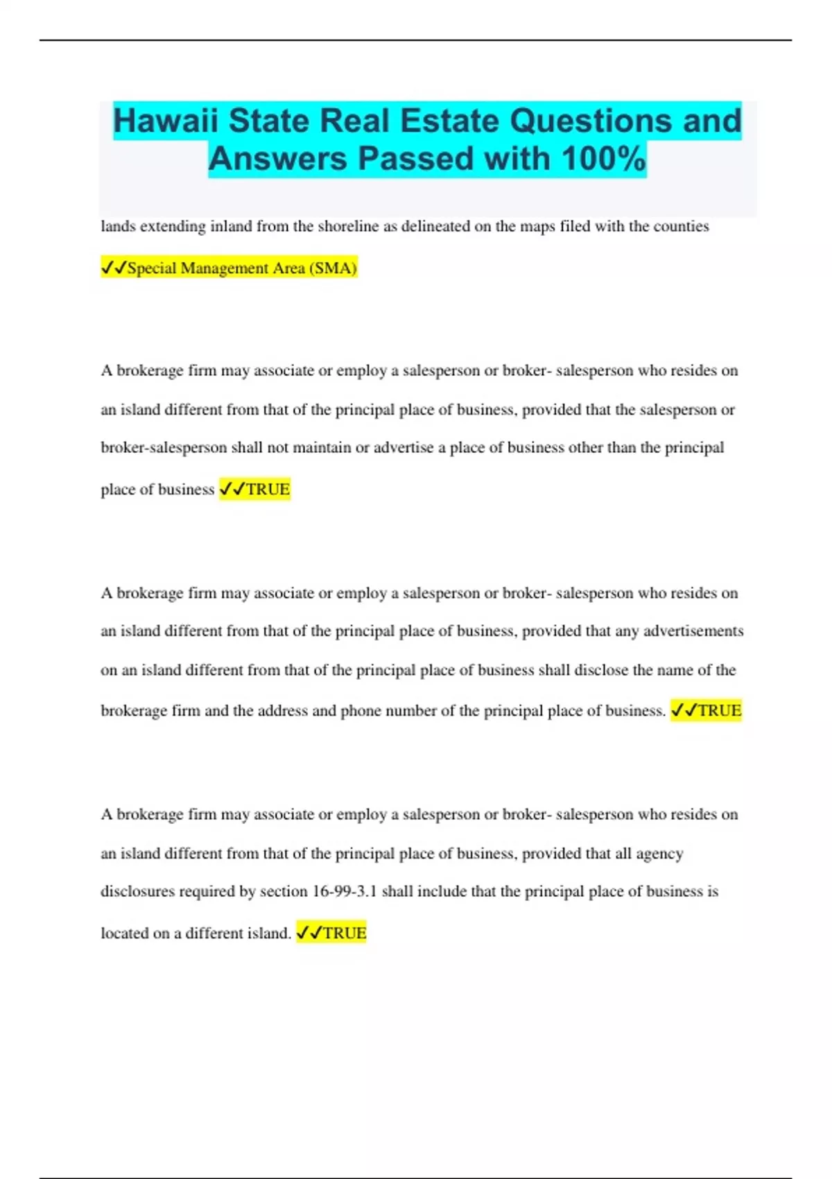 Hawaii State Real Estate Questions and Answers Passed with 100% lands extending inland from the shoreline as delineated on the maps filed with the counties Special Management Area (SMA) A brokerage firm may associate or employ a salesperson or broker- salesperson who resides on an island different from that of the principal place of business, provided that the salesperson or broker-salesperson shall not maintain or advertise a place of business other than the principal place of business TRUE A brokerage firm may associate or employ a salesperson or broker- salesperson who resides on an island different from that of the principal place of business, provided that any advertisements on an island different from that of the principal place of business shall disclose the name of the brokerage firm and the address and phone number of the principal place of business. TRUE A brokerage firm may associate or employ a salesperson or broker- salesperson who resides on an island different from that of the principal place of business, provided that all agency disclosures required by section 16-99-3.1 shall include that the principal place of business is located on a different island. TRUE