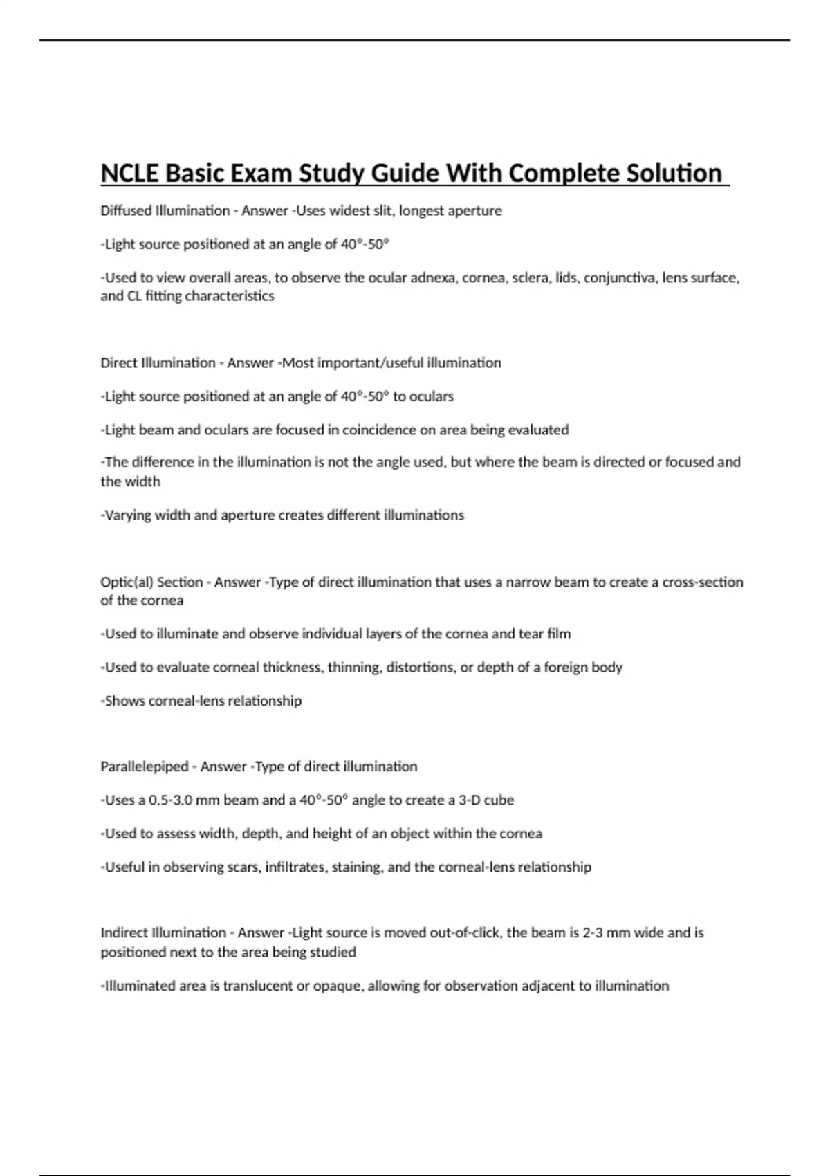 Diffused Illumination - Answer -Uses widest slit, longest aperture -Light source positioned at an angle of 40º-50º -Used to view overall areas, to observe the ocular adnexa, cornea, sclera, lids, conjunctiva, lens surface, and CL fitting characteristics Direct Illumination - Answer -Most important/useful illumination -Light source positioned at an angle of 40º-50º to oculars -Light beam and oculars are focused in coincidence on area being evaluated -The difference in the illumination is not the angle used, but where the beam is directed or focused and the width -Varying width and aperture creates different illuminations Optic(al) Section - Answer -Type of direct illumination that uses a narrow beam to create a cross-section of the cornea -Used to illuminate and observe individual layers of the cornea and tear film -Used to evaluate corneal thickness, thinning, distortions, or depth of a foreign body -Shows corneal-lens relationship Parallelepiped - Answer -Type of direct illumination -Uses a 0.5-3.0 mm beam and a 40º-50º angle to create a 3-D cube -Used to assess width, depth, and height of an object within the cornea -Useful in observing scars, infiltrates, staining, and the corneal-lens relationship Indirect Illumination - Answer -Light source is moved out-of-click, the beam is 2-3 mm wide and is positioned next to the area being studied -Illuminated area is translucent or opaque, allowing for observation adjacent to illumination -Used to observe foreign bodies, corneal nerves, and opacities -Oscillation of light accentuates details Retroillumination - Answer -Light source is out-of-click, moved to the side of the area being observed -Using a 1-3 mm beam, the light is reflected off the iris and used to back-light the area studied -Useful in examining corneal scars, debris, microcysts, scratches on the lens, sub-epithelial changes, corneal vascularization, diffuse edema, and surface deposits Sclerotic Scatter - Answer -Uses a focused parellelepiped placed out-of-click directed at the limbus -Oculars are not used -The light is dispersed at the limbus, reflected through the cornea, creating a circumcorneal halo -Used to observe edema, stromal folds, lens deposits, bubbles under the lens, lens defects, and scratches Corneal Topography - Axial Map - Answer -Most widely understood map of the cornea for many CL fitters -Overall shape of the cornea -Colors relate to steepness/flatness -Sagittal reading measures the curvature of the cornea in diopters and is called the axial power map -Calculates curvature rather than power Corneal Topography - Tangential Map - Answer -More sensitive map of the cornea -Calculates corneal curvature based on the tangent to normal -Found to be more beneficial in identifying corneal pathology -Not used as frequently to fit CLs Corneal Topography - Refractive Power Map - Answer -Show spherical aberrations -More useful when assessing visual performance of post refractive patients Corneal Topography - Elevation Map - Answer -Shows the difference in the elevation of the cornea -Measured in microns Corneal Topography - Irregularity Map - Answer -Similar to elevation maps -Uses best fit toric surface as a reference -Eliminates any toricity from the eye and displays the elevation differences