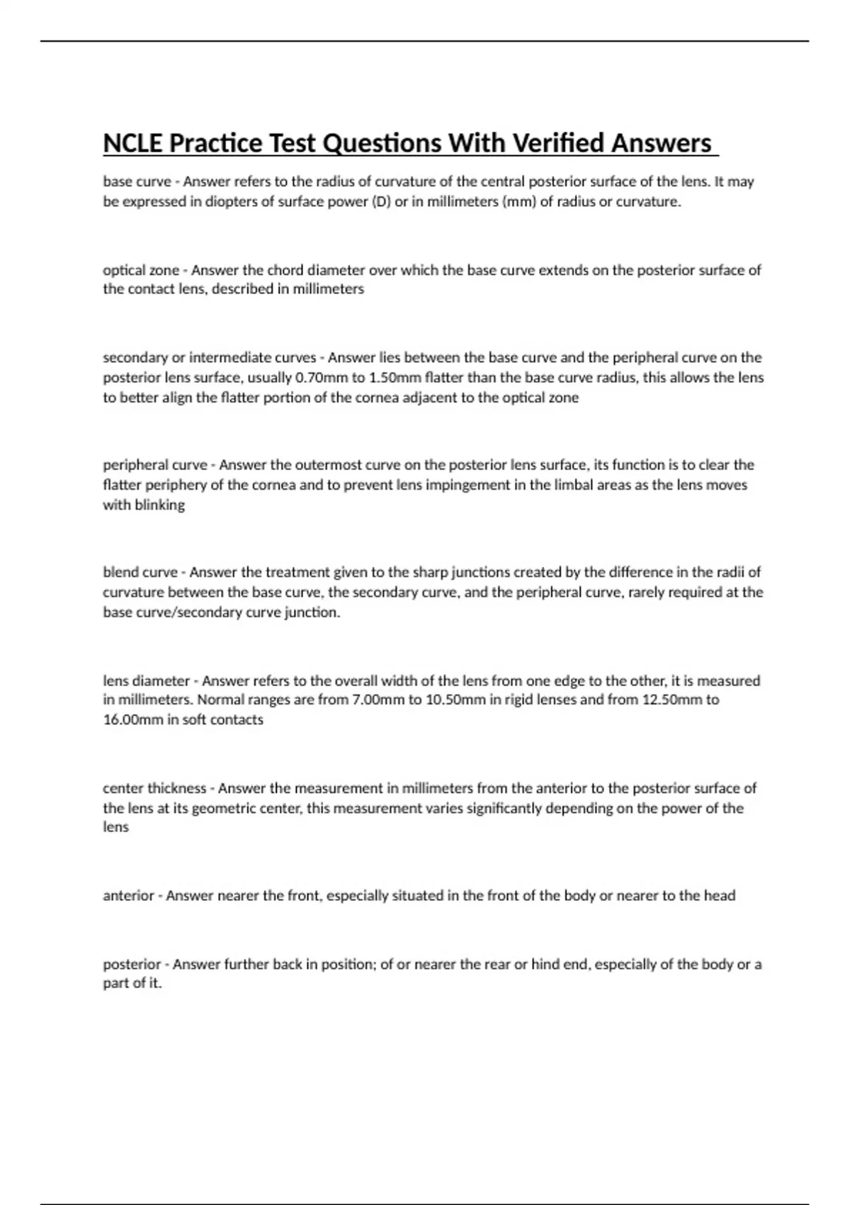 base curve - Answer refers to the radius of curvature of the central posterior surface of the lens. It may be expressed in diopters of surface power (D) or in millimeters (mm) of radius or curvature. optical zone - Answer the chord diameter over which the base curve extends on the posterior surface of the contact lens, described in millimeters secondary or intermediate curves - Answer lies between the base curve and the peripheral curve on the posterior lens surface, usually 0.70mm to 1.50mm flatter than the base curve radius, this allows the lens to better align the flatter portion of the cornea adjacent to the optical zone peripheral curve - Answer the outermost curve on the posterior lens surface, its function is to clear the flatter periphery of the cornea and to prevent lens impingement in the limbal areas as the lens moves with blinking blend curve - Answer the treatment given to the sharp junctions created by the difference in the radii of curvature between the base curve, the secondary curve, and the peripheral curve, rarely required at the base curve/secondary curve junction. lens diameter - Answer refers to the overall width of the lens from one edge to the other, it is measured in millimeters. Normal ranges are from 7.00mm to 10.50mm in rigid lenses and from 12.50mm to 16.00mm in soft contacts center thickness - Answer the measurement in millimeters from the anterior to the posterior surface of the lens at its geometric center, this measurement varies significantly depending on the power of the lens anterior - Answer nearer the front, especially situated in the front of the body or nearer to the head posterior - Answer further back in position; of or nearer the rear or hind end, especially of the body or a part of it. lens power - Answer the difference between the radii of the anterior and posterior lens surface abrasion - Answer rubbing off of the superficial layer accommodation - Answer adjustment by the eye for seeing different distances, accomplished by changing the shape of the crystalline lens through action of the ciliary muscle acuity - Answer clearness; measured by the smallest object that can seen at a certain distance adnexa oculi - Answer accessory structures of the eye, such as lacrimal apparatus and the eye lids albinism - Answer hereditary loss of pigment in the eye, skin & hair; usually associated with lowered visual acuity, nystagmus & light sensitivity amblyopia - Answer loss of vision with any apparent disease of the eye ametropia - Answer a refractive error in which the eye, when in state of rest, does not focus the image of an object upon the retina; includes hyperopia,myopia and astigmatism aniridia - Answer congenital absence of the iris aniseikonia - Answer a condition in which the ocular image of an object as seen by one eye differs so much in size or shape from the seen by the other eye that the two images cannot be fused into a single impression aniscoria - Answer inequality of the pupils in diameter anomaly - Answer departure from the normal anopthalmia - Answer absence of a true eyeball anterior chamber - Answer space in front of the eye, bounded in front by the cornea and behind by the iris; filled with aqueous humor antibody - Answer a specific substance produced by the body in the presence of an antigen antigen - Answer any substance that acts against the action of histamine aphakia - Answer absence of the crystalline lens of the eye aqueous humor - Answer clear, watery fluid that fills the anterior and posterior chambers within the front part of the eye arcus senilus - Answer grayish white ring in the periphery of the cornea asthenopia - Answer eye fatigue caused by tiring of the internal and/or external muscles astigmatism - Answer a refractive error that prevents light rays from coming to a single focus on the retina because of different degrees of refraction in the various meridians of the eye against-the-rule astigmatism - Answer condition in which the steepest corneal meridian is in the horizontal plane. An example of keratometer readings for a patient exhibiting this condition would be: K's 45.00@180/42.00@90 irregular astigmatism - Answer astigmatism caused by an irregularly shaped cornea lenticular astigmatism - Answer astigmatism found in the crystalline lens oblique astigmatism - Answer regular astigmatism in which the principal meridians are other than 90 & 180 residual astigmatism - Answer astigmatism remaining after the corneal astigmatism has been neutralized with-the-rule astigmatism - Answer condition in which the steepest corneal meridian is in the vertical plane, an example of keratometer reading for a patient exhibiting this condition would be: K's: 42.00@180/45.00@90 atrophy - Answer wasting or decrease of tissue due to faulty nutrition or loss of verve supply back vertex power (BVP) - Answer when neutralizing a lens, the concave or the posterior side of the lens in placed against the aperture of the lensometer bedewing (Cornea) - Answer an edematous condition of the epithelium of the cornea characterized by irregular reflecting from a multitude of droplets when the cornea is viewed with the slit lamp