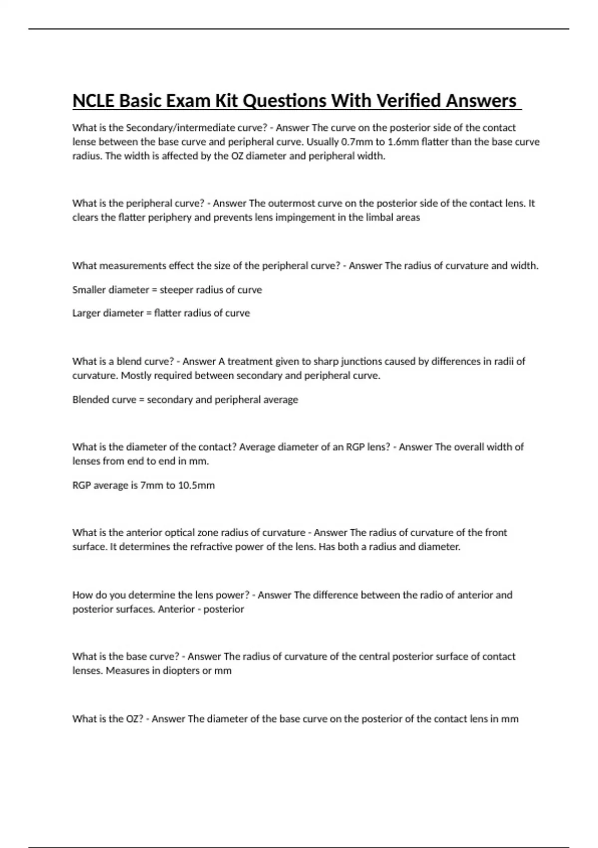 What is the Secondary/intermediate curve? - Answer The curve on the posterior side of the contact lense between the base curve and peripheral curve. Usually 0.7mm to 1.6mm flatter than the base curve radius. The width is affected by the OZ diameter and peripheral width. What is the peripheral curve? - Answer The outermost curve on the posterior side of the contact lens. It clears the flatter periphery and prevents lens impingement in the limbal areas What measurements effect the size of the peripheral curve? - Answer The radius of curvature and width. Smaller diameter = steeper radius of curve Larger diameter = flatter radius of curve What is a blend curve? - Answer A treatment given to sharp junctions caused by differences in radii of curvature. Mostly required between secondary and peripheral curve. Blended curve = secondary and peripheral average What is the diameter of the contact? Average diameter of an RGP lens? - Answer The overall width of lenses from end to end in mm. RGP average is 7mm to 10.5mm What is the anterior optical zone radius of curvature - Answer The radius of curvature of the front surface. It determines the refractive power of the lens. Has both a radius and diameter. How do you determine the lens power? - Answer The difference between the radio of anterior and posterior surfaces. Anterior - posterior What is the base curve? - Answer The radius of curvature of the central posterior surface of contact lenses. Measures in diopters or mm What is the OZ? - Answer The diameter of the base curve on the posterior of the contact lens in mm What is a lenticular flange? - Answer An increase or decrease in anterior edge thickness to change the lens mass or help with the positioning What is the myoflange design? - Answer An increase in anterior edge thickness that aids in better centering lenses that sit low on the cornea. Thicker = more kid interaction. The upper lid holds the lens higher What is the hyperflange or CN bevel design? - Answer A decrease in anterior edge thickness in high minus lenses to limit lid interaction. Allows lens to position more centrally on the cornea Lenticular flange steeper radius vs. flatter radius - Answer Radius between 1.5mm to 2.2mm Steeper (1.7mm) edge is too thick and lens rises high Flatter (2.2mm) edge too thin and lid control is lost About the lens edge - Answer Has 3 zones. It is the most peripheral part of the lens. The junction of posterior and anterior. Designed to limit adverse lid irritation during blinking. Helps keep posterior surface away from the cornea. Anterior zone of lens edge - Answer Part of the edge in contact with the upper lid during the blink cycle. Minimizes lid irritation during blinking Posterior zone of the lens edge - Answer Small reverse curve on the posterior surface to flare the edge away from the cornea. Allows free movement of the lens across the cornea during eye excursions and for lens removal using scissor blink technique. Also allows lens to be safely centered on cornea when it dislocates. Edge apex of the lens edge - Answer Junction between anterior and posterior zones. Must be well rounded to minimize lid awareness during blink Prism ballast - Answer Adding plastic to the anterior surface. Adds weight to the lens and gives it proper orientation of some astigmatism and bifocal designs What is the watermelon seed effect? - Answer The prism ballast takes place throughout the squeezing action of the upper lid which forces the lens downward. The more thickness let's lower lid force upward during downgaze. Happens with bifocals too. What is truncation? - Answer The removal of the inferior and/or superior parts of the lens to aid in meridional orientation and stabilization. This can be done with front toric or bifocal lenses. Spherical lens design - Answer The radius of curvature is the same in every meridian of each lens surface. The lens remains spherical even though the radius is different on each surface The front surface toric design - Answer Has a spherical posterior surface with a toric anterior curve. Usually needs a prism ballast to keep in place Back surface toric design - Answer Toric posterior curve with 2 different principle meridians 90 degrees apart. Anterior side is spherical. Controls rotation with more than 2 diopters of corneal astigmatism. Only works when refractive cylinder is 1/3 more than the corneal astigmatism because there is increased power transferred to the front of the contact. Bitoric lens design - Answer Has toric curves on both surfaces with the principle meridians 90 degrees apart. Used to improve lens position for high astigmatism. Also corrects any residual refractive component. What is K? - Answer The flattest of the primary meridians measured by keratometry Sagittal depth - Answer The distance between the central area and the flat surface on the posterior surface. Adnexa Oculi - Answer The accessory structures of the eye. Includes eyelids, eyelashes, lacrimal apparatus and conjunctiva Functions of the eyelids - Answer Distributes tears over the anterior part of the eye and limits the amount of light that enters the eye Palpebral fissure - Answer An opening formed by the eye lid margins 28-30mm horizontally by 14-15mm vertically in adults. Canthi - Answer The junctions of the upper and lower lid margins. Lateral canthus - Answer Outer canthus, forms an acute angle Medial canthus - Answer inner corner of the eye where the upper and lower eyelids meet. Rounded Caruncle - Answer Small mound of skin found at the medial canthus. Contains sweat and sebaceous glands. Appears as a yellowish elevation. Semilunar fold - Answer Lateral to the caruncle. A vestigial remnant of the third eyelid of lower animal species. Epicanthus - Answer A vertical fold of skin extending from the upper to lower lid. Can be seen in infants. Disappears with development except in Asian races where it remains and forms the almond shaped eye. Puncta - Answer An opening that drains tears from the eye about 5m