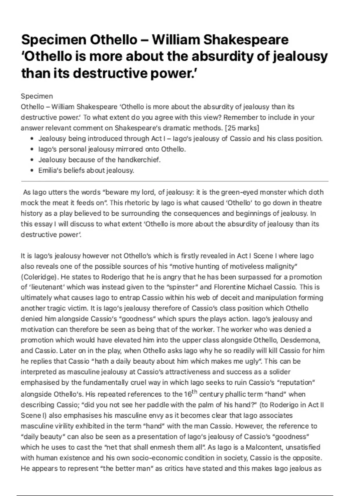 Summary A* AQA ENGLISH LITERATURE OTHELLO ESSAY - Specimen Othello – William Shakespeare ‘Othello is more about the absurdity of jealousy than its consequences