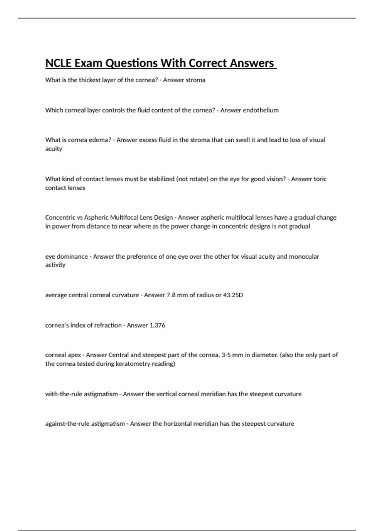 What is the thickest layer of the cornea? - Answer stroma Which corneal layer controls the fluid content of the cornea? - Answer endothelium What is cornea edema? - Answer excess fluid in the stroma that can swell it and lead to loss of visual acuity What kind of contact lenses must be stabilized (not rotate) on the eye for good vision? - Answer toric contact lenses Concentric vs Aspheric Multifocal Lens Design - Answer aspheric multifocal lenses have a gradual change in power from distance to near where as the power change in concentric designs is not gradual eye dominance - Answer the preference of one eye over the other for visual acuity and monocular activity average central corneal curvature - Answer 7.8 mm of radius or 43.25D cornea's index of refraction - Answer 1.376 corneal apex - Answer Central and steepest part of the cornea, 3-5 mm in diameter. (also the only part of the cornea tested during keratometry reading) with-the-rule astigmatism - Answer the vertical corneal meridian has the steepest curvature against-the-rule astigmatism - Answer the horizontal meridian has the steepest curvature Oblique astigmatism - Answer regular astigmatism in which the principal meridians are other than 90 & 180 Irregular astigmatism - Answer The principal meridians are not 90 degrees apart HVID (horizontal visible iris diameter) - Answer measured corneal diameter. average= 11.7 mm Apical Alignment/Lid Attachment - Answer upper lens edge is tucked unter upper eye lid and moves with blinking motion What material is used to evaluate GP lenses under a slit lamp? - Answer fluorescein Increasing saggital depth will... - Answer tighten lens fit How to decrease saggital depth - Answer decrease diameter and/or flatten base curve Lenticular Astigmatism - Answer astigmatism found in the crystalline lens What is neutralization in the lens care system? - Answer neutralizing hydrogen peroxide disinfectant before wear contact lenses on the eye How much NaCl is in the tear film and saline solution? - Answer 0.9% What is used to rinse/wet contact lens rather than tap water? - Answer saline solution How much refractive astigmatism is allowable for spherical SOFT contact lenses? - Answer ~0.75 D or less oxygen transmissibility formula - Answer Dk/t What's the difference between Schirmer's Test 1 and 2? - Answer Test 2 involves stimulatingthe nasal musoca to measure reflex tearing. Sjoren's syndrome - Answer autoimmune disease that causes dry eye. (moisture-producing glands in the body are attacked) A healthy tear break up time is - Answer 10-12 secs Neovascularization - Answer formation of new blood vessels Munson's sign - Answer V-shape of the cornea that indicates Keratoconus Corneal Infiltrates - Answer an accumulation of inflammatory cells (whitish opacity or gray haze) in the stroma CLARE - Answer contact lens associated red eye CLPU - Answer contact lens peripheral ulcer Hydra-PEG - Answer permanent treatment done to GP lenses to increase wettability and minimize deposits plasma treatment - Answer use of oxygen to remove debri from GP lenses after manufacturing Optic Flare - Answer stray light refracted by peripheral curves of contact lens (rather than optic zone) because the edge of the lens is too close to the pupil Where is the tarsal plate? What are they responsible for? - Answer rigid part of eyelid that contains meibomiam glands that secrete lipid layer of tears average pH of tear film - Answer 7.4 bulbar conjunctiva - Answer overlays the eyeball, with the white sclera showing through palpebral conjunctiva - Answer lines the eyelids Deturgescence, Corneal - Answer The state of relative dehydration maintained by the normal intact cornea which enables it to remain transparent 3 and 9 o'clock staining - Answer flourescein pattern in the horizontal margin due to tight lens-to-cornea relationship and poor tear film distribution Myoflange - Answer to increase edge thickness in high plus lenses Hyperflange - Answer Plus lenticulation. to decrease edge thickness in high minus lenses
