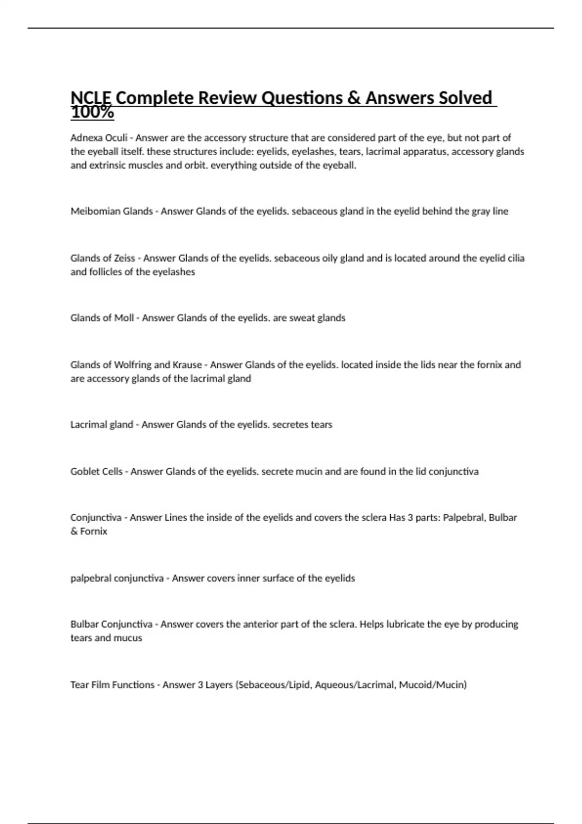 Adnexa Oculi - Answer are the accessory structure that are considered part of the eye, but not part of the eyeball itself. these structures include: eyelids, eyelashes, tears, lacrimal apparatus, accessory glands and extrinsic muscles and orbit. everything outside of the eyeball. Meibomian Glands - Answer Glands of the eyelids. sebaceous gland in the eyelid behind the gray line Glands of Zeiss - Answer Glands of the eyelids. sebaceous oily gland and is located around the eyelid cilia and follicles of the eyelashes Glands of Moll - Answer Glands of the eyelids. are sweat glands Glands of Wolfring and Krause - Answer Glands of the eyelids. located inside the lids near the fornix and are accessory glands of the lacrimal gland Lacrimal gland - Answer Glands of the eyelids. secretes tears Goblet Cells - Answer Glands of the eyelids. secrete mucin and are found in the lid conjunctiva Conjunctiva - Answer Lines the inside of the eyelids and covers the sclera Has 3 parts: Palpebral, Bulbar & Fornix palpebral conjunctiva - Answer covers inner surface of the eyelids Bulbar Conjunctiva - Answer covers the anterior part of the sclera. Helps lubricate the eye by producing tears and mucus Tear Film Functions - Answer 3 Layers (Sebaceous/Lipid, Aqueous/Lacrimal, Mucoid/Mucin) Lipid - Answer fatty Aqueous - Answer nutrients Mucoid - Answer wetting and lubrication Break-up time - Answer (BUT) - Interval between a complete blink and the first randomly distributed dry spot (10-40 seconds in normal). under 10 seconds could indicate marginal dry eye. fluorescein is used for this test Schirmer Test - Answer Determines if eye produces enough tears via placing a strip in the lower eyelid. 35-40 mm of wetting from the lid indicates normal lacrimal secretion inserted in eye 5mm strip Rose Bengal - Answer Reddish-purple dye used to detect damaged superficial corneal and conjunctival cells Jones Test - Answer Evaluates tear drainage system function. This test measures the length of time for fluorescein dye to appear inside the nose after being instilled in the cornea. Upper lashes - Answer are longer and curl up and there about 100 - 150 lashes Bottom lashes - Answer turn downward and number about 50 - 75 Corneal Topography - Answer Transparent and Avascular- (no blood). Main Refracting Surface of the eye. 75% of refraction takes place at the cornea. Convex, aspheric and smooth and tends to flatten toward the periphery. Average Refractive Power Of The Cornea - Answer is about +43.00 D *** Average Corneal Thickness - Answer is about .52mm. .53 in center, thinner and more rounded. .71 thicker and smaller at the periphery Horizontal Visible Iris Diameter - Answer 11.5 mm x 10.5 mm. HVID- normal size of the iris fitting for the contact to fit this area Apical Zone - Answer Is a Zone of the Cornea. Regular in shape Largest in center. Average size varies about 4-6mm. Referred to as Corneal Cap. Displaced up and in nasally. Apical Zone Points - Answer Visual Center, Apex & Geometric Center of the Cornea. Visual Center - Answer the point where the visual axis passes through. Part of the Apical zone. Apex - Answer steepest point on the cornea usually displaced up and in from the geometric center. Part of the Apical zone. Geometric Center Of The Cornea - Answer Part of the Apical zone. The intersection f widest ad shortest diameter of the cornea Transition Zone - Answer Is a Zone of the Cornea. Area between the Apical zone and the limbus. Area of the cornea with the greatest aspheric curvature. In this zone the cornea flattens out more temporally than nasally. 1 mm adjacent to the sclera Limbal Zone - Answer Is a Zone of the Cornea. Area near the periphery of the cornea about 1 mm adjacent to the sclera. Area is not well defined and blends into the Transition Zone of the cornea Sulcus - Answer Depression or "ditch" around the cornea and is divides the cornea from the sclera. Usually referred to as the external boundary of the cornea Layers of the Cornea - Answer Epithelium, Bowman's Membrane, stroma, Descemet's Membrane, Endothelium Epithelium - Answer Outermost layer of the cornea and is 5-6 layers thick (has 3 cell layers). Will repair itself. 3 cell layers: Squamous (flat), Wing cell, Basal cell layer (inner most layer). Bowman's Membrane - Answer Thin elastic acellular membrane of stromal collagen if damaged will scar. Cannot be separated from the stroma. Stroma - Answer middle layer of the cornea and makes up about 90% of total corneal thickness. If damaged, the stroma will leave a scar. Descemet's Membrane - Answer Elastic membrane secreted by the endothelium. Will reform if damaged. Can rupture and edges curl up under slit lamp observation. Endothelium - Answer innermost layer of the cornea. Cells are "hexagonal in shape. Cells do not regenerate when damaged. Single layer of cells for maintaining the integrity of the corneal from within. Looks like an endothelial mosaic. Polymegethsim - Answer variation in cell size, Endothelium Disorders Polymorphism - Answer variation in cell shape, Endothelium Disorders Endothelial Guttata - Answer deposits on the endothelium indicating endothelial dysfunction, Endothelium Disorders Corneal Transparency and Metabolism - Answer if there is blockage it can lead to swelling. do not want to put on an eye that can lead to edema. Osmosis, Endothelial or Metabolic Pump. Corneal Deturgescence - Answer State of dehydration, 25% 30% dehydration. Glucose - Answer form of energy is supplied to the endothelium by the aqueous humor ATP - Answer (Adenosine triphosphate) is formed when glucose breaks down into the nucleus of the cells creating a pumping action, therefore maintains the proper water balance in the cornea. the most active layers for the metabolism are. sources of nutrients, glucose, oxygen, amino acids. corneal hydration. the state of relative dehydration that is necessary for corneal transparency. normal water content is a constant 80%. Edema - Answer Swelling of corneal tissue and 