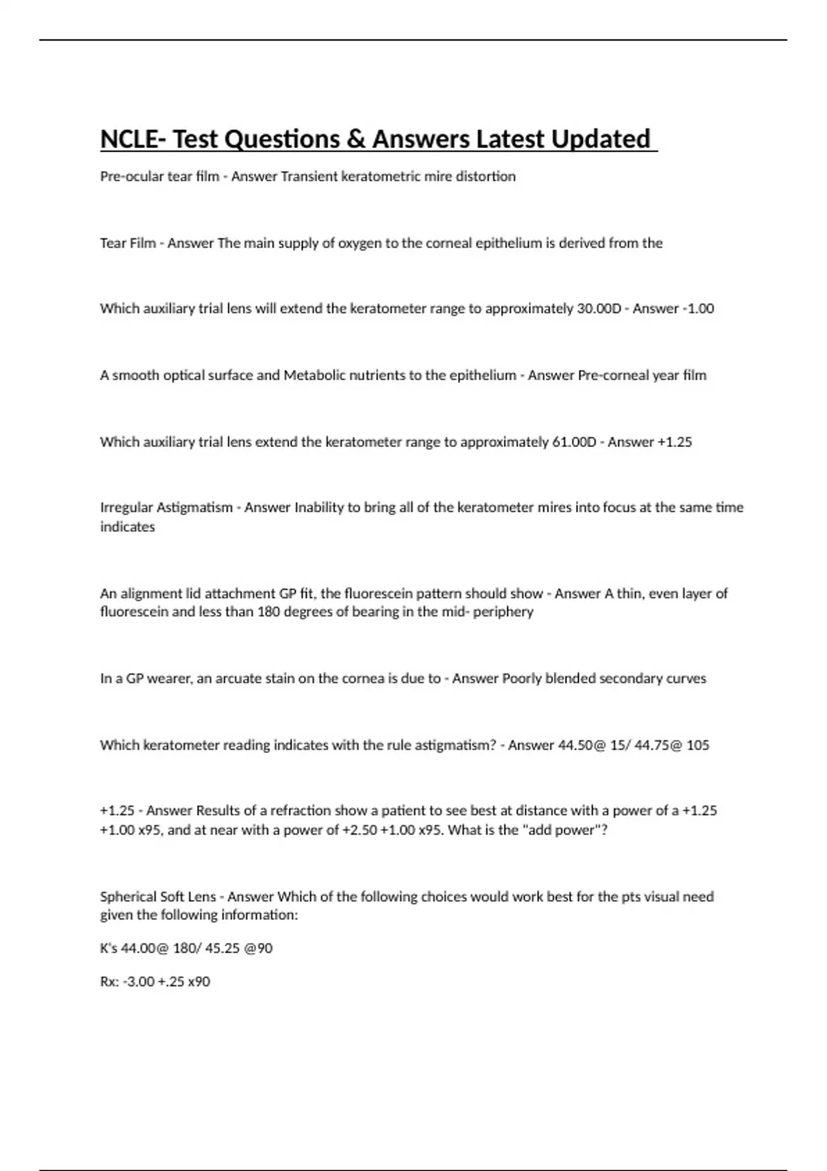 Pre-ocular tear film - Answer Transient keratometric mire distortion Tear Film - Answer The main supply of oxygen to the corneal epithelium is derived from the Which auxiliary trial lens will extend the keratometer range to approximately 30.00D - Answer -1.00 A smooth optical surface and Metabolic nutrients to the epithelium - Answer Pre-corneal year film Which auxiliary trial lens extend the keratometer range to approximately 61.00D - Answer +1.25