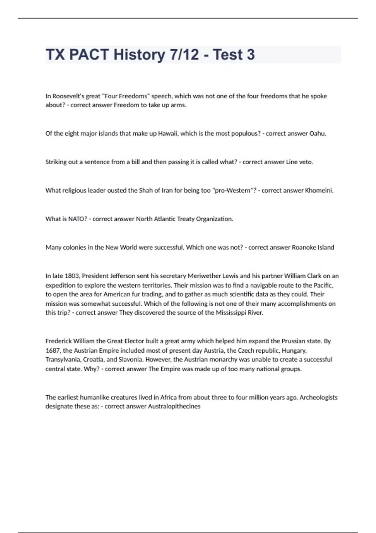 TX PACT History 7 12 - Test 3In Roosevelt's great "Four Freedoms" speech, which was not one of the four freedoms that he spoke about? - correct answer Freedom to take up arms. Of the eight major islands that make up Hawaii, which is the most populous? - correct answer Oahu. Striking out a sentence from a bill and then passing it is called what? - correct answer Line veto. What religious leader ousted the Shah of Iran for being too "pro-Western"? - correct answer Khomeini. What is NATO? - correct answer North Atlantic Treaty Organization. Many colonies in the New World were successful. Which one was not? - correct answer Roanoke Island In late 1803, President Jefferson sent his secretary Meriwether Lewis and his partner William Clark on an expedition to explore the western territories. Their mission was to find a navigable route to the Pacific, to open the area for American fur trading, and to gather as much scientific data as they could. Their mission was somewhat successful. Which of the following is not one of their many accomplishments on this trip? - correct answer They discovered the source of the Mississippi River. Frederick William the Great Elector built a great army which helped him expand the Prussian state. By 1687, the Austrian Empire included most of present day Austria, the Czech republic, Hungary, Transylvania, Croatia, and Slavonia. However, the Austrian monarchy was unable to create a successful central state. Why? - correct answer The Empire was made up of too many national groups. The earliest humanlike creatures lived in Africa from about three to four million years ago. Archeologists designate these as: - correct answer Australopithecines In the early sixteenth century, the Plains Indians were among the poorest and hungriest of the Native Americans. Nomadic people, they used their brains and boldness to find food. Which is not true of these peoples before the middle of the sixteenth century? - correct answer They hunt buffalo on horseback. The South raised a sunken Union ship and fitted it with iron plates. It terrorized the Union fleet off Hampton Roads, Virginia, sinking two ships and threatening the entire fleet. The Union navy responded by fitting up their own ship. On March 9, 1862, the two ships met for an epic battle. Which ship was fighting for the South? - correct answer The Virginia What nation founded the present state of New York? - correct answer Holland. If both the President and the Vice President are unable to fulfill their duties of office, who is next in line? - correct answer Speaker of the House. A requirement to be the President of the United States is to be a resident of the US for how many years? - correct answer 14. Affairs in Europe during the nineteenth century affected world events. How did Napoleon's wars in Europe affect the colonies in Latin America? - correct answer When Napoleon overthrew the governments of Spain and Portugal, their authority in their Latin American colonies was compromised. This document established in 1620 helped establish the principle of self-government in America. What is it? - correct answer The Mayflower Compact What Roman emperor or Caesar ordered the building of the Colosseum? - correct answer Vespasian The Amendment 16 is which of the below? - correct answer Status of Income Tax Clarified No Soldier shall, in time of peace be quartered in any house, without the consent of the Owner, nor in time of war, but in a manner to be prescribed by law." The quote above is from which of the following Amendments to the U.S. Constitution? - correct answer Third Amendment.