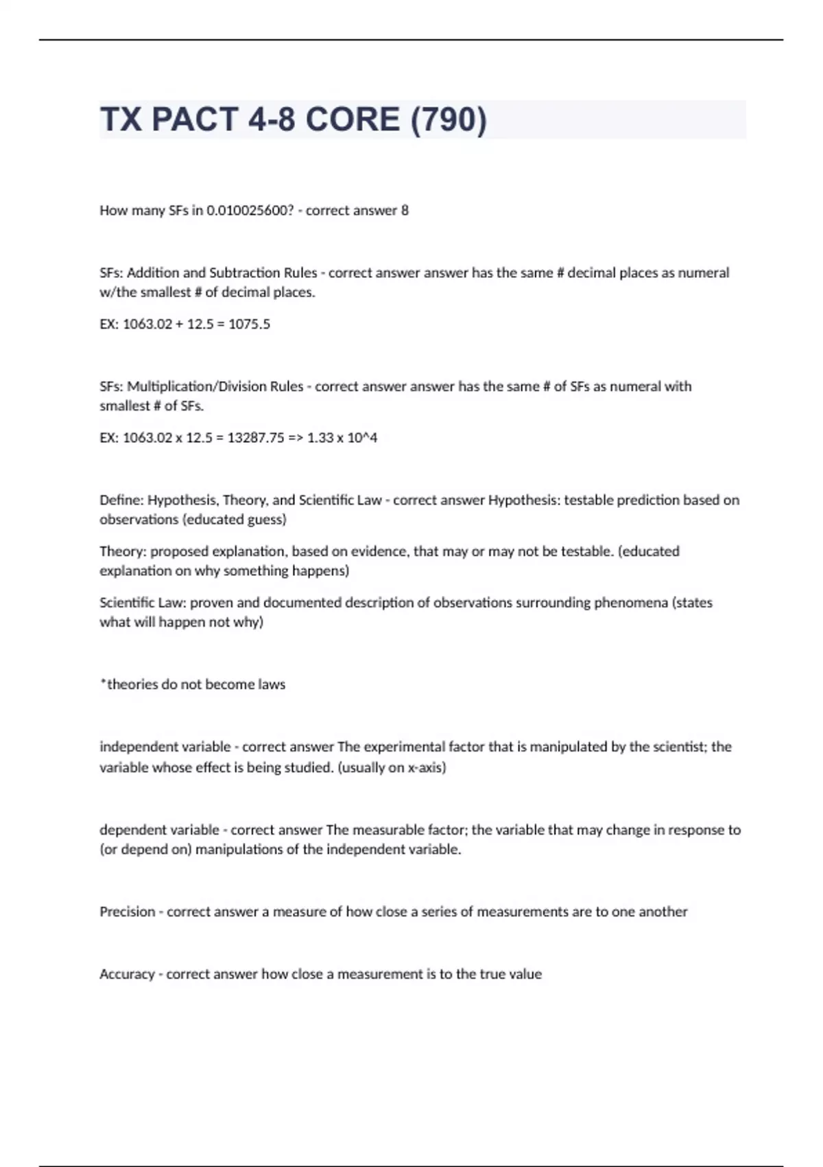 TX PACT 4-8 CORE (790)How many SFs in 0.? - correct answer 8 SFs: Addition and Subtraction Rules - correct answer answer has the same # decimal places as numeral w/the smallest # of decimal places. EX: 1063.02 + 12.5 = 1075.5 SFs: Multiplication/Division Rules - correct answer answer has the same # of SFs as numeral with smallest # of SFs. EX: 1063.02 x 12.5 = 13287.75 => 1.33 x 10^4 Define: Hypothesis, Theory, and Scientific Law - correct answer Hypothesis: testable prediction based on observations (educated guess) Theory: proposed explanation, based on evidence, that may or may not be testable. (educated explanation on why something happens) Scientific Law: proven and documented description of observations surrounding phenomena (states what will happen not why) *theories do not become laws independent variable - correct answer The experimental factor that is manipulated by the scientist; the variable whose effect is being studied. (usually on x-axis) dependent variable - correct answer The measurable factor; the variable that may change in response to (or depend on) manipulations of the independent variable. Precision - correct answer a measure of how close a series of measurements are to one another Accuracy - correct answer how close a measurement is to the true value Negative feedback - correct answer A type of regulation that responds to a change in conditions by initiating responses that will counteract the change or correct the system back to original state. Maintains a steady state (homeostasis). EX: body temperature Positive feedback - correct answer A type of regulation that responds to a change in conditions by initiating responses that will amplify the change. Takes organism away from a steady state. EX: Global warming or contractions Matter - correct answer Anything that has mass and takes up space (made up of atoms) Ground state of atoms - correct answer lowest energy, most stable electron configuration Neutrons - correct answer neutral charge; mass # - atomic # (protons) Quantum Model - correct answer current atomic model in which e- move in waves around nucleus (w/ uncertain positions in an e- cloud) Molecules vs. Compounds - correct answer Molecules: Groups of two or more atoms held together by chemical bonds Ex: O2 & consist of compounds too Compounds: 2 or more DIFF. elements held by ionic or molecular bonds Ex: H2O, NaCl, etc.. Isotopes - correct answer atoms w/ same # of protons, but diff. # of neutrons Radioactivity - correct answer The spontaneous nuclear emission of radiation by an unstable atomic nucleus, which changes # of protons (identity of element)