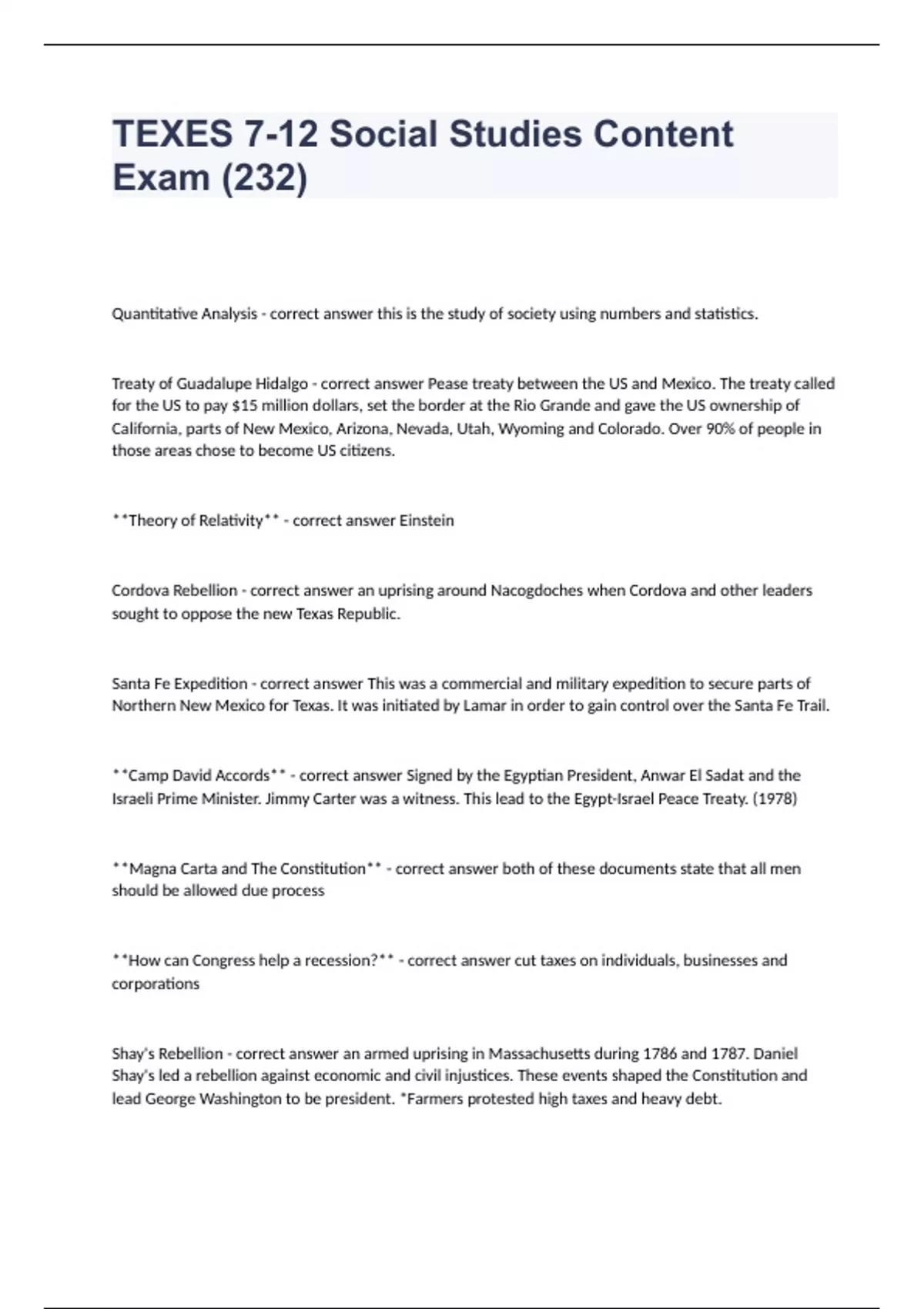 TEXES 7-12 Social Studies Content Exam (232) Quantitative Analysis - correct answer this is the study of society using numbers and statistics. Treaty of Guadalupe Hidalgo - correct answer Pease treaty between the US and Mexico. The treaty called for the US to pay $15 million dollars, set the border at the Rio Grande and gave the US ownership of California, parts of New Mexico, Arizona, Nevada, Utah, Wyoming and Colorado. Over 90% of people in those areas chose to become US citizens. **Theory of Relativity** - correct answer Einstein Cordova Rebellion - correct answer an uprising around Nacogdoches when Cordova and other leaders sought to oppose the new Texas Republic. Santa Fe Expedition - correct answer This was a commercial and military expedition to secure parts of Northern New Mexico for Texas. It was initiated by Lamar in order to gain control over the Santa Fe Trail. **Camp David Accords** - correct answer Signed by the Egyptian President, Anwar El Sadat and the Israeli Prime Minister. Jimmy Carter was a witness. This lead to the Egypt-Israel Peace Treaty. (1978) **Magna Carta and The Constitution** - correct answer both of these documents state that all men should be allowed due process **How can Congress help a recession?** - correct answer cut taxes on individuals, businesses and corporations Shay's Rebellion - correct answer an armed uprising in Massachusetts during 1786 and 1787. Daniel Shay's led a rebellion against economic and civil injustices. These events shaped the Constitution and lead George Washington to be president. *Farmers protested high taxes and heavy debt. ancient greek slaves - correct answer prisoners of war Battle of San Jacinto - correct answer Surprise attack on the Mexican Army by Sam Houston's Texas militia. The Texans had more artillery during this battle which ended the Texas Revolution. Texas captured or killed the entire Mexican army and Santa Anna in 18 minutes. Four pillars of Reaganomics - correct answer reduce the growth of government spending, reduce federal income tax and capital gains, reduce government regulation and tighten the money supply to reduce inflation. **The Feminine Mystique** - correct answer a book by Betty Friedman which discussed the lives of unhappy housewives in America. **Progressive Era amendments** - correct answer 16th (federal government can collect income tax) 17th (direct election of Senators) 18th (prohibition began) 19th (women's right to vote) **North's strengths** - correct answer larger population, industrial advantage, imported gun powder, and controlled the navy & seas **South's strengths** - correct answer could produce food, trained officers, fought in it's territory *most wars were fought in the Gulf Coast Region, had better skilled military leaders, were defending their homes **Comanche** - correct answer The most skilled tribe in horse breeding and training Comanche, Apache and Kiowa - correct answer all 3 of these native American tribes lived on the plains Karankawas - correct answer lived between Galveston and Corpus Christi. These native Americans practiced ceremonial cannibalism where they would consume parts of the conquered enemies. What did the ancient Mayans worship? - correct answer Nature. Sun God, Maize God and Rain God The constitution of 1824 - correct answer established a republican government in Mexico but failed to mention states rights Treaty of Velasco - correct answer This treaty ended the war between Texas and Mexico on May 14, 1836 and set the boundary at Rio Grande. Santa Ana agreed to withdraw his troops from Texas but the Mexican government refused to recognize Texas as independent. Sweatt vs. Painter - correct answer ended segregation at UT and was a precedent to Brown vs. Board Cabeza de la Vava - correct answer Spanish explorer who shipwrecked and explored most of the region that would eventually be Texas. expansionary policy - correct answer to increase government spending and lower taxes in order to reduce unemployment contractionary policy - correct answer to help counteract inflation, increase taxes and decrease government spending. **If the British pounds falls in value, should the US import more or export more to Britain?** - correct answer Import more. Export less. They could spend less US dollars to get the same amount of British goods. William Travis - correct answer Commander of the Alamo, was determined to hold his position, managed to send message through Mexican lines asking for help. He was killed in the battle of the Alamo. Texas Independence Day - correct answer March 2, 1836 Stephen F Austin - correct answer "Father of Texas", he led a project to settle 300 families in Texas. He was the first man to bring Anglos to Texas Washington on the Brazos - correct answer where the Texas Declaration of Independence was signed (location of the 1836 Convention)