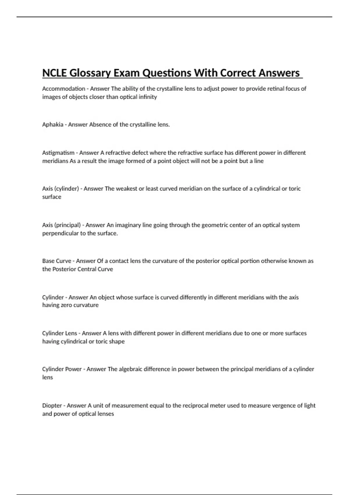 Accommodation - Answer The ability of the crystalline lens to adjust power to provide retinal focus of images of objects closer than optical infinity Aphakia - Answer Absence of the crystalline lens. Astigmatism - Answer A refractive defect where the refractive surface has different power in different meridians As a result the image formed of a point object will not be a point but a line Axis (cylinder) - Answer The weakest or least curved meridian on the surface of a cylindrical or toric surface Axis (principal) - Answer An imaginary line going through the geometric center of an optical system perpendicular to the surface. Base Curve - Answer Of a contact lens the curvature of the posterior optical portion otherwise known as the Posterior Central Curve Cylinder - Answer An object whose surface is curved differently in different meridians with the axis having zero curvature Cylinder Lens - Answer A lens with different power in different meridians due to one or more surfaces having cylindrical or toric shape Cylinder Power - Answer The algebraic difference in power between the principal meridians of a cylinder lens Diopter - Answer A unit of measurement equal to the reciprocal meter used to measure vergence of light and power of optical lenses Dispersion - Answer The separation of white light into its spectral colors Effectivity - Answer Changes in the vergence of light between one point and another In contact lens practice this change is most often observed when the position of the correcting lens is moved from the spectacle plane to the corneal plane Focal Length - Answer The distance from the vertex of an optical surface to its focal point The reciprocal of the focal length is the power Focal Point - Answer The point along the principal axis of an optical surface where incident parallel light will be focused after being converged or diverged by the surface Focus - Answer The point along the principal axis of an optical surface that light converges to or diverges away from after encountering that surface Image - Answer An optical reproduction of an object by a lens or mirror. REAL images are formed where converging light focuses, and VIRTUAL images are formed where diverging light focuses Index of Refraction - Answer The ratio of the speed of light in a vacuum (or air) to the speed in another medium indicating the medium's refractive ability Infinity (optical) - Answer The distance light waves must travel from a source to lose all curvature and be essentially parallel This distance is considered to be twenty feet K Readings - Answer Also K's The measurement of the curvature of the central cornea as measured by the Keratometer Keratoconus - Answer A cone-shaped deformity of the cornea Lacrimal Lens - Answer The lens that is formed by the tears that collect between the base curve of a contact lens and the anterior cornea Macula - Answer The most sensitive part of the retina Theoretically the macula would be located where the principal axis intersects the retina Normal - Answer A line drawn perpendicular to the surface Object - Answer The source of light being imaged by an optical system Pencil - Answer A small cluster of light rays Power - Answer The ability of an optical surface to change the vergence of light incident upon it (See Vertex Power) Principal Meridians - Answer The meridians of MOST and LEAST curvature or GREATEST and WEAKEST power on a cylindrical or toric surface Prism - Answer An optical device with non-parallel sides The thinnest end is called the APEX and the thickest end is the BASE Prism Ballast - Answer A prismatic shape used in a contact lens to stabilize the lens by preventing rotation Prism Diopter - Answer The unit of measurement to describe the power of prism to deviate light One prism diopter produces a deviation of one centimeter at a distance of one meter Radius of Curvature - Answer An expression of the curvature of a surface by stating the length of the curve's radius The shorter the radius the steeper the curve Base curves of contact lenses are usually expressed in this way