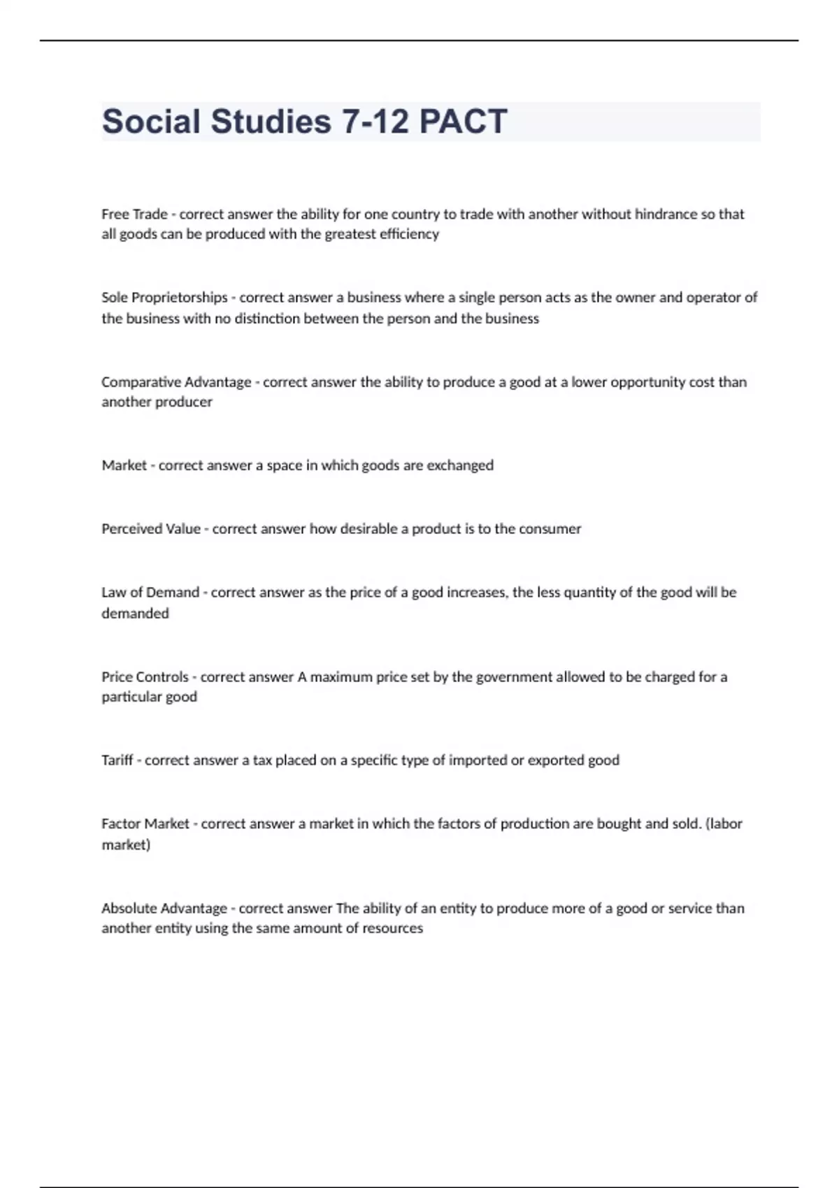 Social Studies 7-12 PACTFree Trade - correct answer the ability for one country to trade with another without hindrance so that all goods can be produced with the greatest efficiency Sole Proprietorships - correct answer a business where a single person acts as the owner and operator of the business with no distinction between the person and the business Comparative Advantage - correct answer the ability to produce a good at a lower opportunity cost than another producer Market - correct answer a space in which goods are exchanged Perceived Value - correct answer how desirable a product is to the consumer Law of Demand - correct answer as the price of a good increases, the less quantity of the good will be demanded Price Controls - correct answer A maximum price set by the government allowed to be charged for a particular good Tariff - correct answer a tax placed on a specific type of imported or exported good Factor Market - correct answer a market in which the factors of production are bought and sold. (labor market) Absolute Advantage - correct answer The ability of an entity to produce more of a good or service than another entity using the same amount of resources Monopoly - correct answer A market where one firm controls the price, production, and supply of a good Means of Production - correct answer The non-human resources used to produce goods in an economy Oligopoly - correct answer A market where only a few sellers are present Cost-Benefit Analysis - correct answer Consideration of what one gains and loses from a set of economic choices Interdependence of Economies - correct answer all economies require each other to function Economies of Scale - correct answer a reduction in the price of per-unit production resulting from producing more at once (buying raw materials in bulk) Mixed Economy - correct answer a market economy with varying levels of government intervention Opportunity Cost - correct answer The cost of the next best opportunity a person gives up when they make an economic choice Communism - correct answer A political theory and economic system in which all property is publicly owned and each person works and is paid according to their abilities and needs. Factors of Production - correct answer The determinants of when and where economic activity can and most likely will occur: land, labor, capital, and entrepreneurship Traditional Economy - correct answer An economy where goods are produced mainly for consumption by one's own family and traded or bartered in only the most basic ways Scarcity - correct answer In Economics, the fact that there are not enough resources to fulfill all human needs and desires