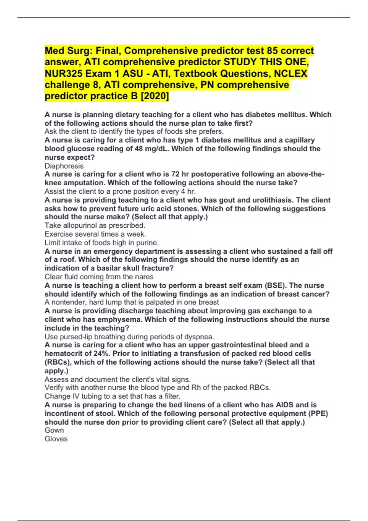 Med Surg: Final, Comprehensive predictor test 85 correct answer, ATI comprehensive predictor STUDY THIS ONE, NUR325 Exam 1 ASU - ATI, Textbook Questions, NCLEX challenge 8, ATI comprehensive, PN comprehensive predictor practice B [2020]